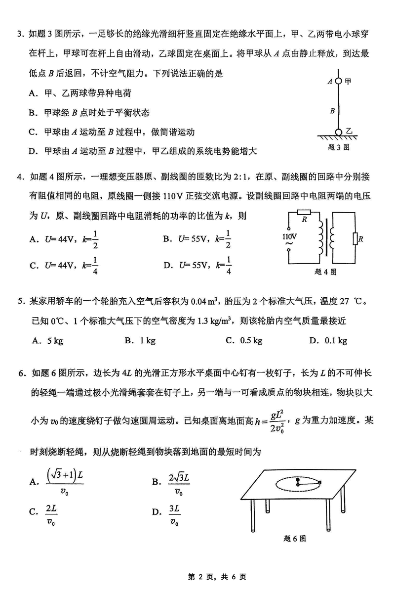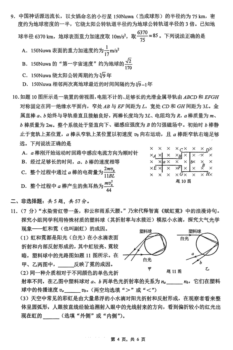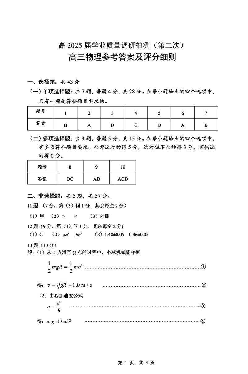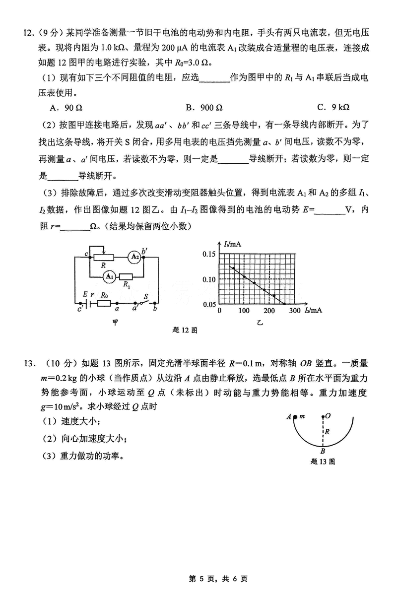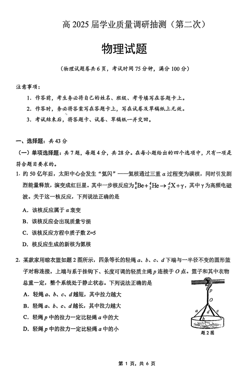 2025届重庆主城五区二诊物理试题及答案