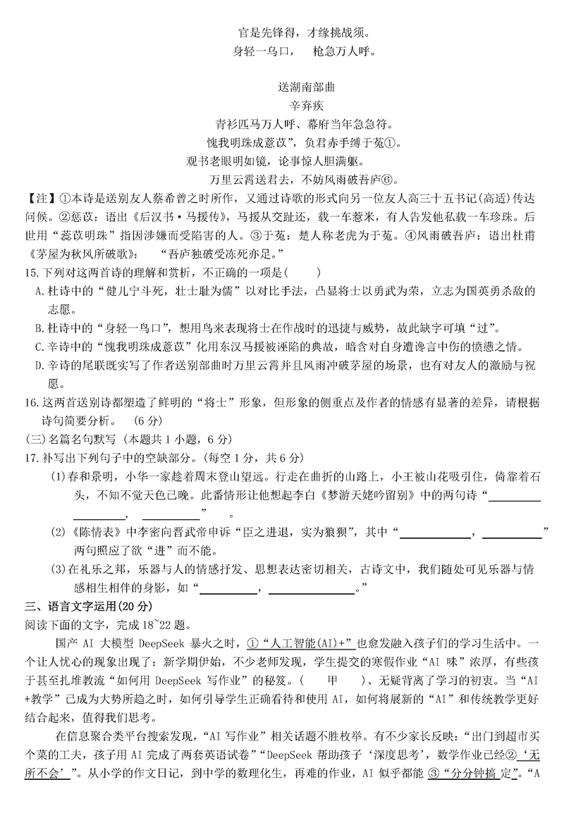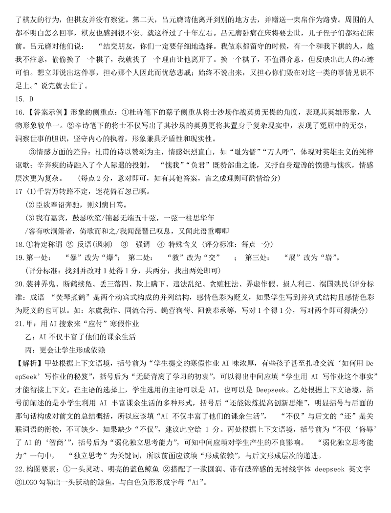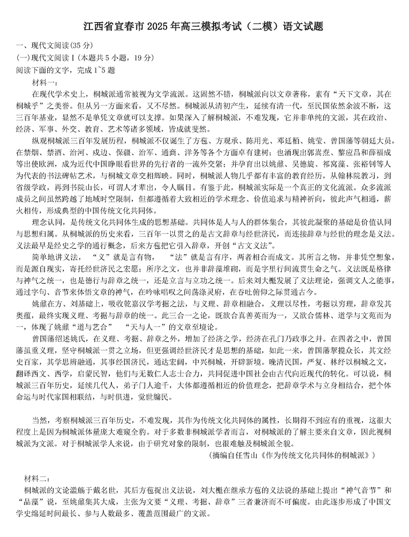 宜春二模2025届高三下学期4月模考语文试题及答案 时间:2025-04-21 江西 语文试题 宜春二模2025届高三下学期4月模考语文考试已于近日开考,为方便考生考后及时查看考试情况,查漏补缺、弥补不足,本文整理了试题答案解析相关信息! 汇总:宜春二模2025届高三下学期4月模考试题及答案汇总 语文试题及答案解析