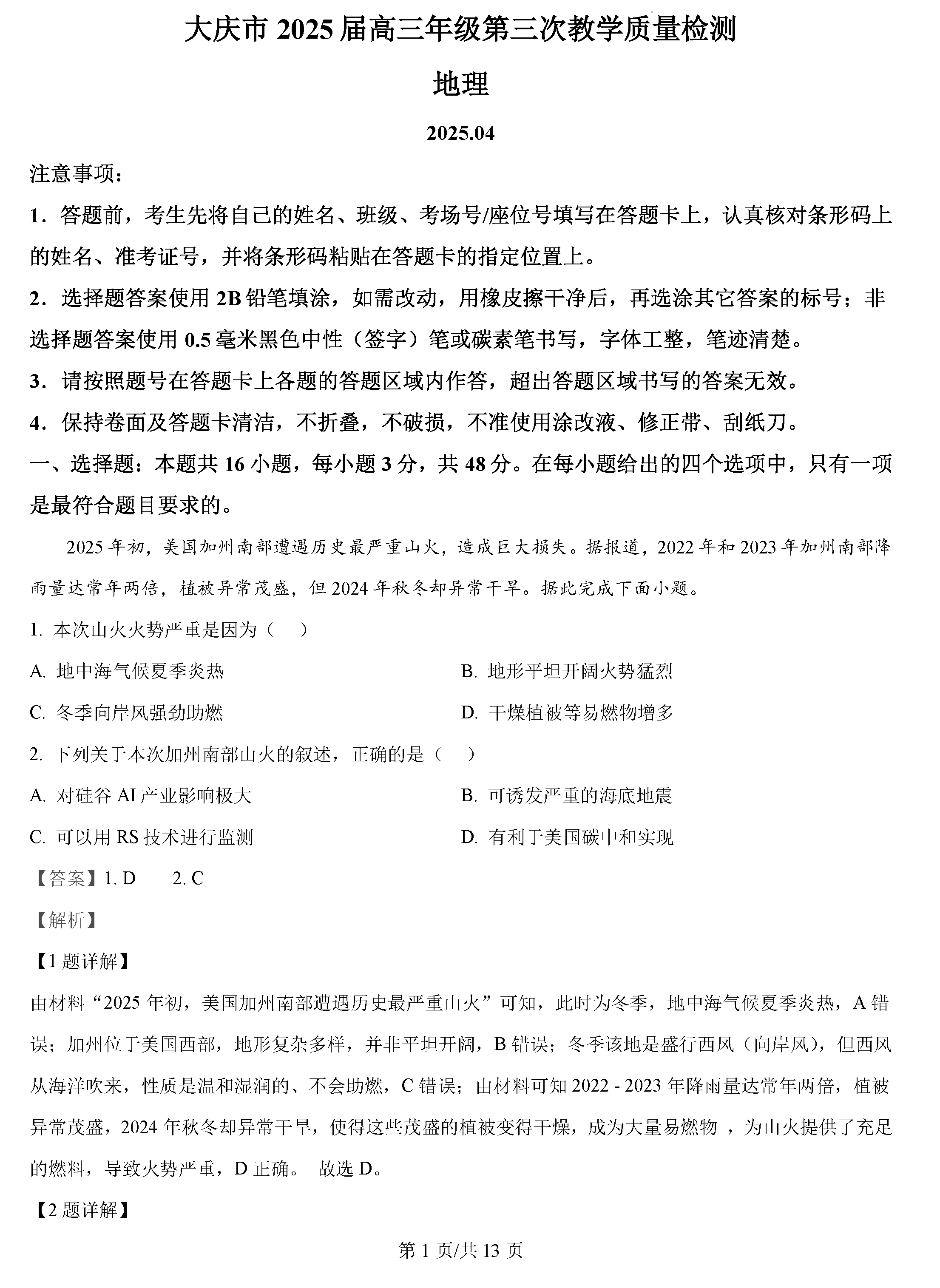 黑龙江大庆2025届高三下学期第三次模考地理试题及答案