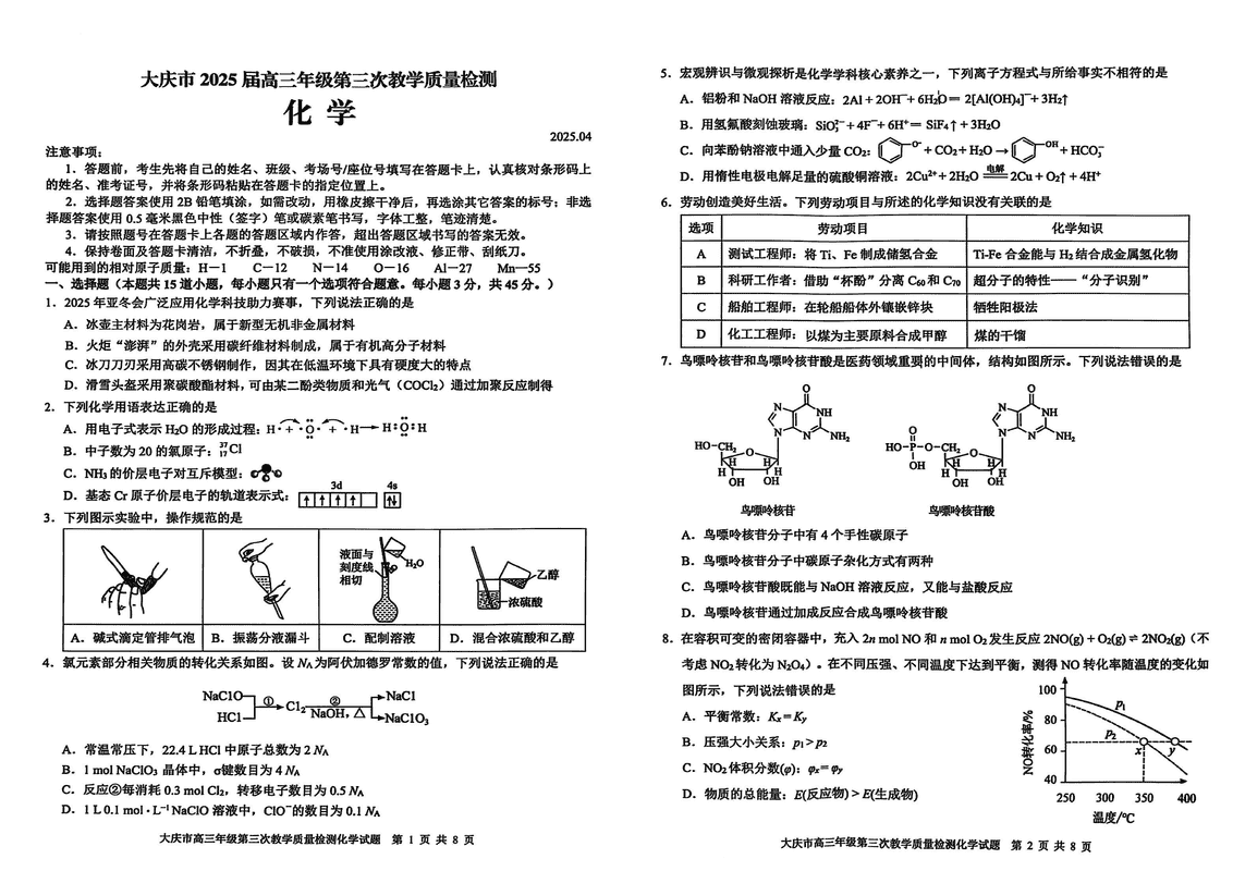 黑龙江大庆2025届高三下学期第三次模考化学试题及答案