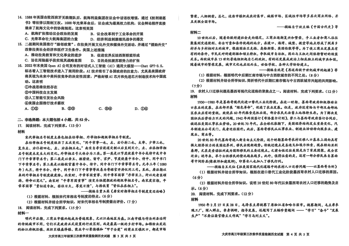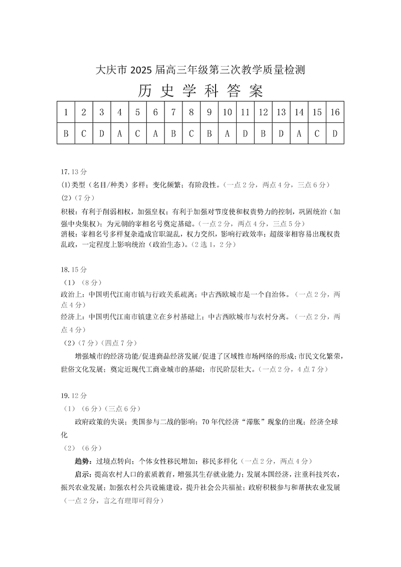 黑龙江大庆2025届高三下学期第三次模考历史试题及答案