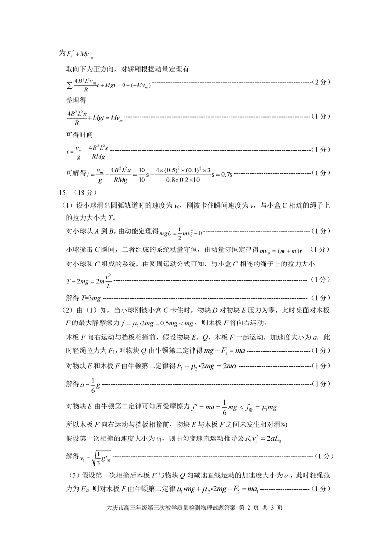 黑龙江大庆2025届高三下学期第三次模考物理试题及答案