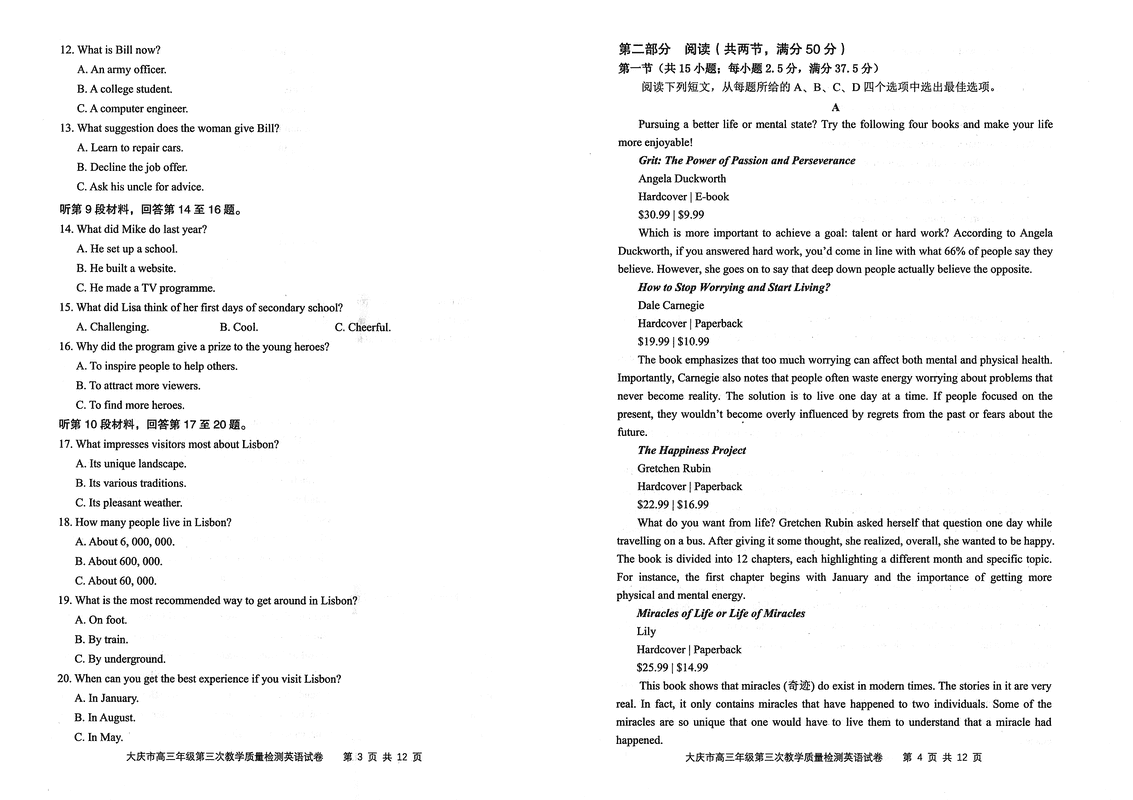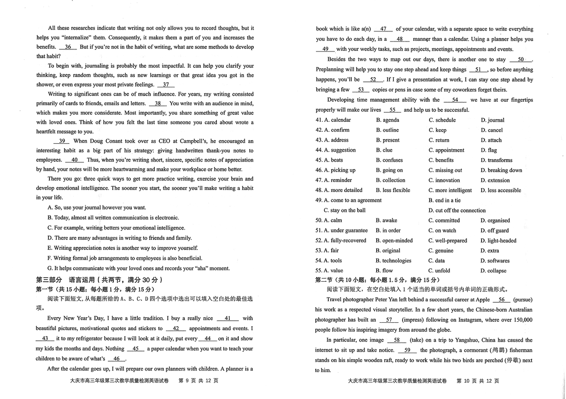 黑龙江大庆2025届高三下学期第三次模考英语试题及答案