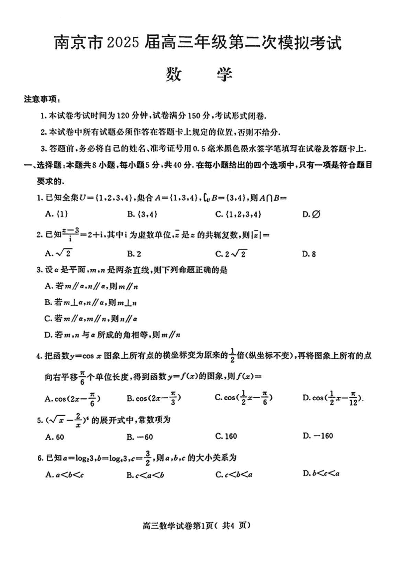 南京市2025届高三第二次模考数学考试已于近日开考,为方便考生考后及时查看考试情况,查漏补缺、弥补不足,本文整理了试题答案解析相关信息!