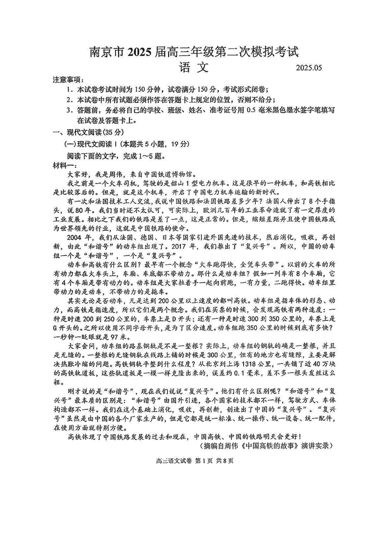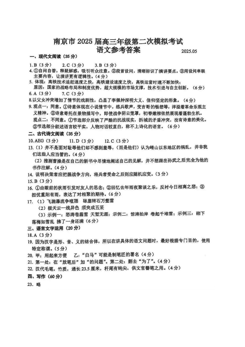 南京市2025届高三第二次模考语文试题及答案