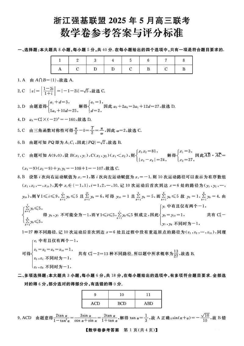 浙江省强基联盟2025届高三下学期5月联考数学试题及答案