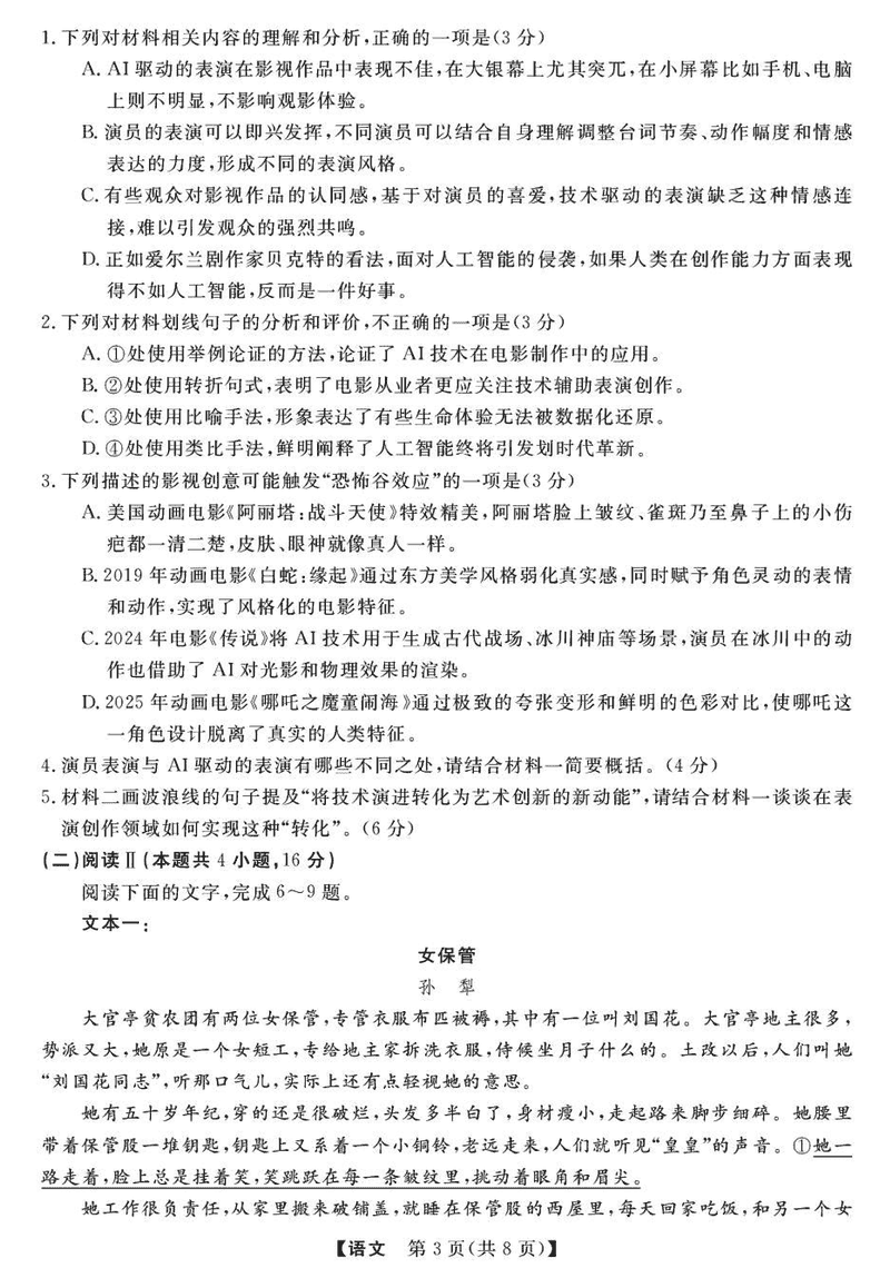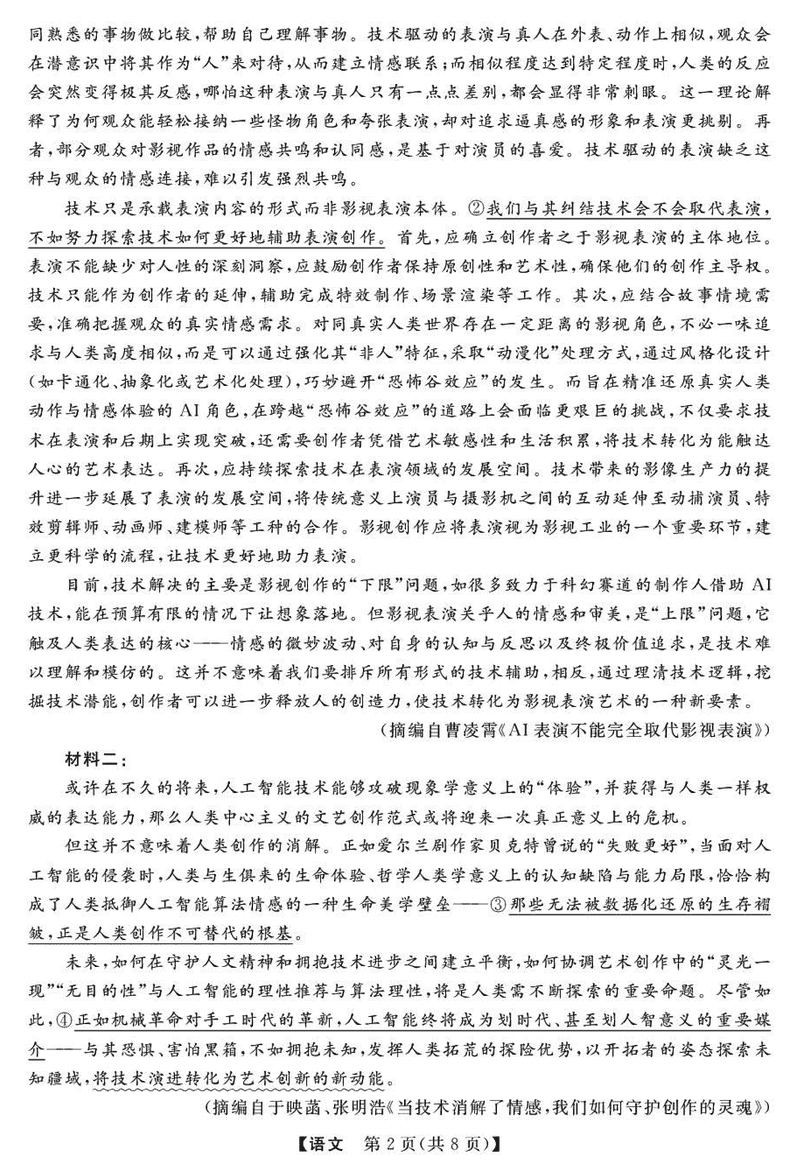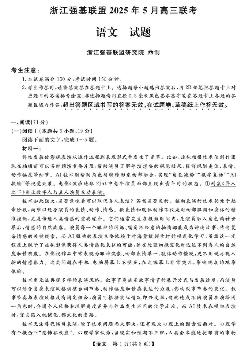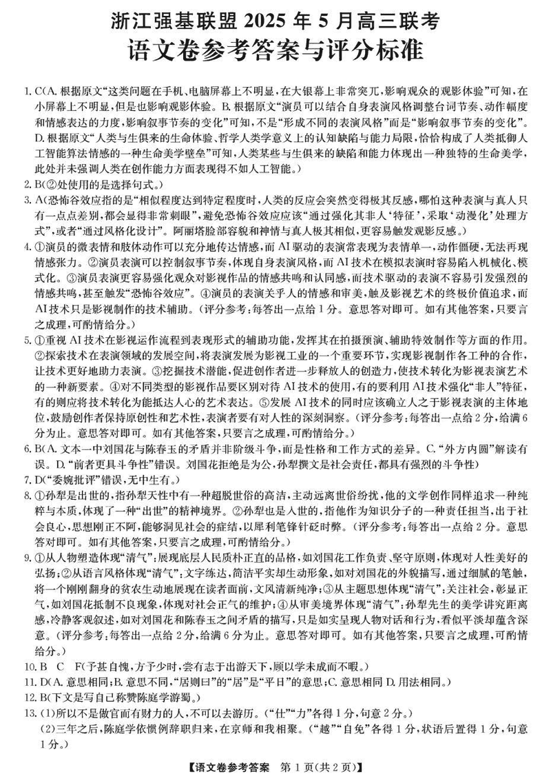 浙江省强基联盟2025届高三下学期5月联考语文试题及答案
