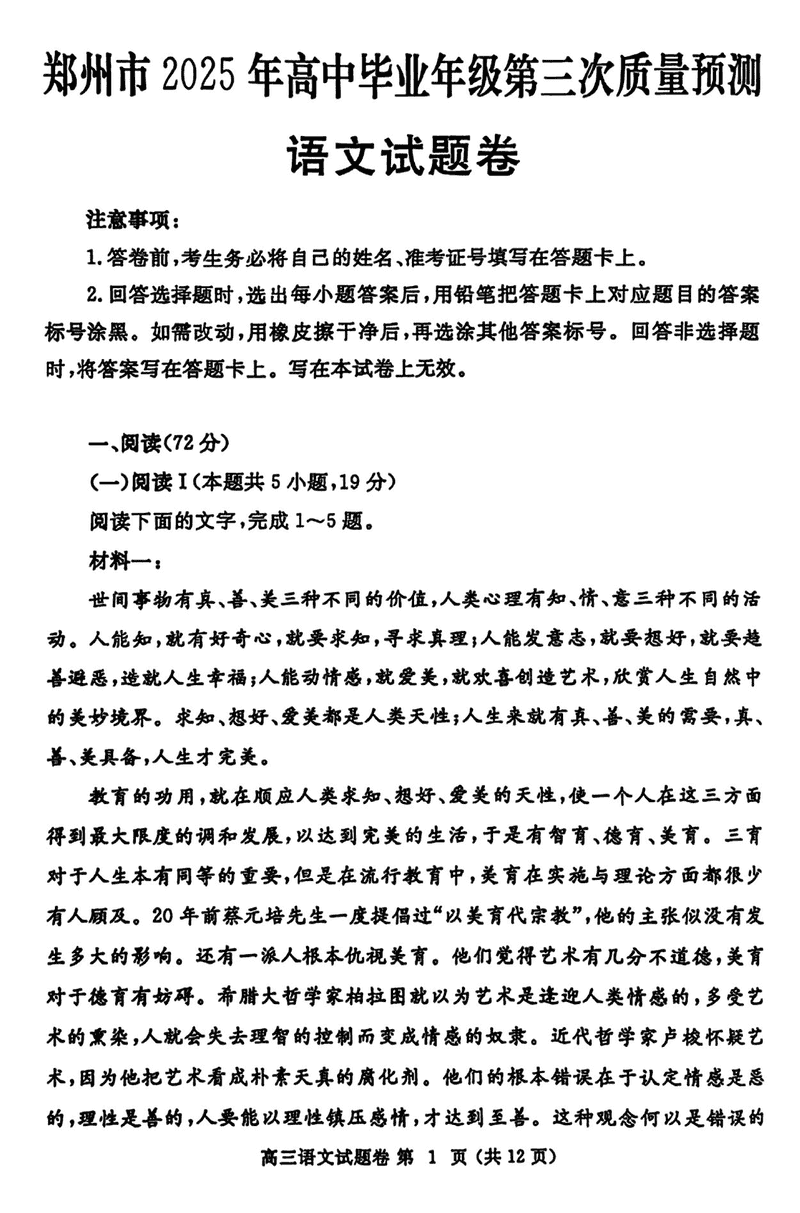 郑州市2025年高三下学期第三次质量预测语文考试已于近日开考,为方便考生考后及时查看考试情况,查漏补缺、弥补不足,本文整理了试题答案解析相关信息!