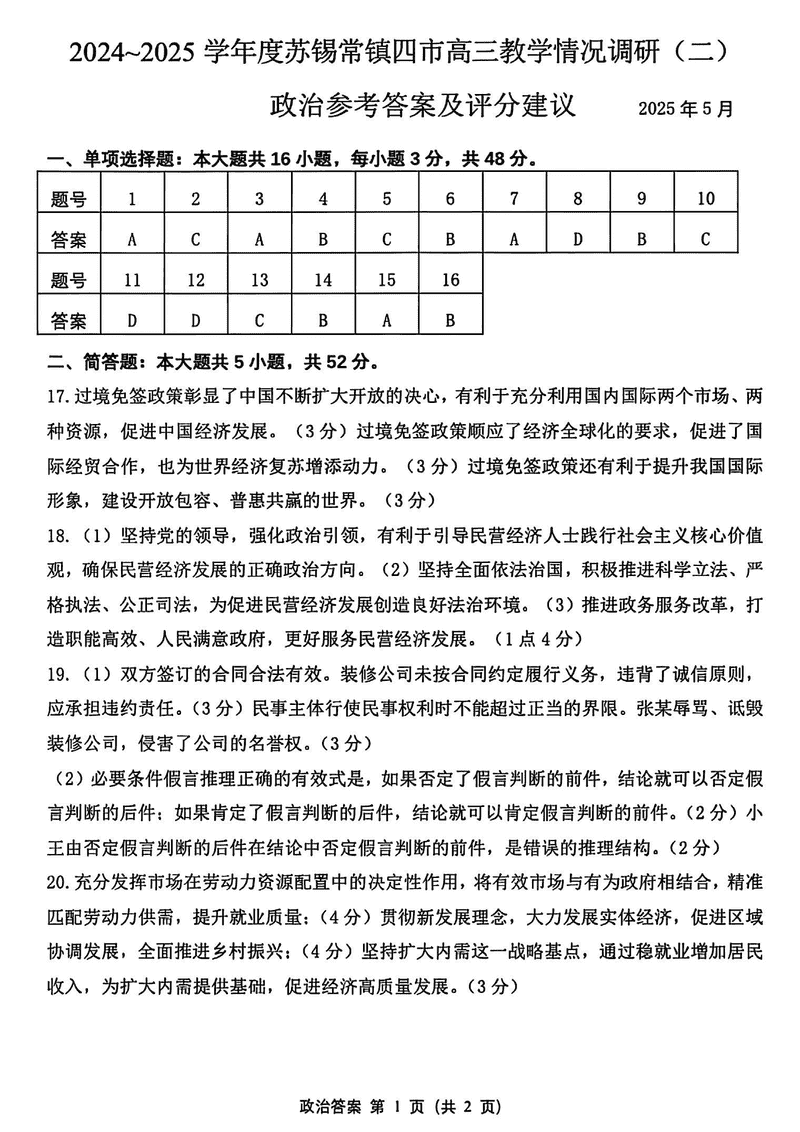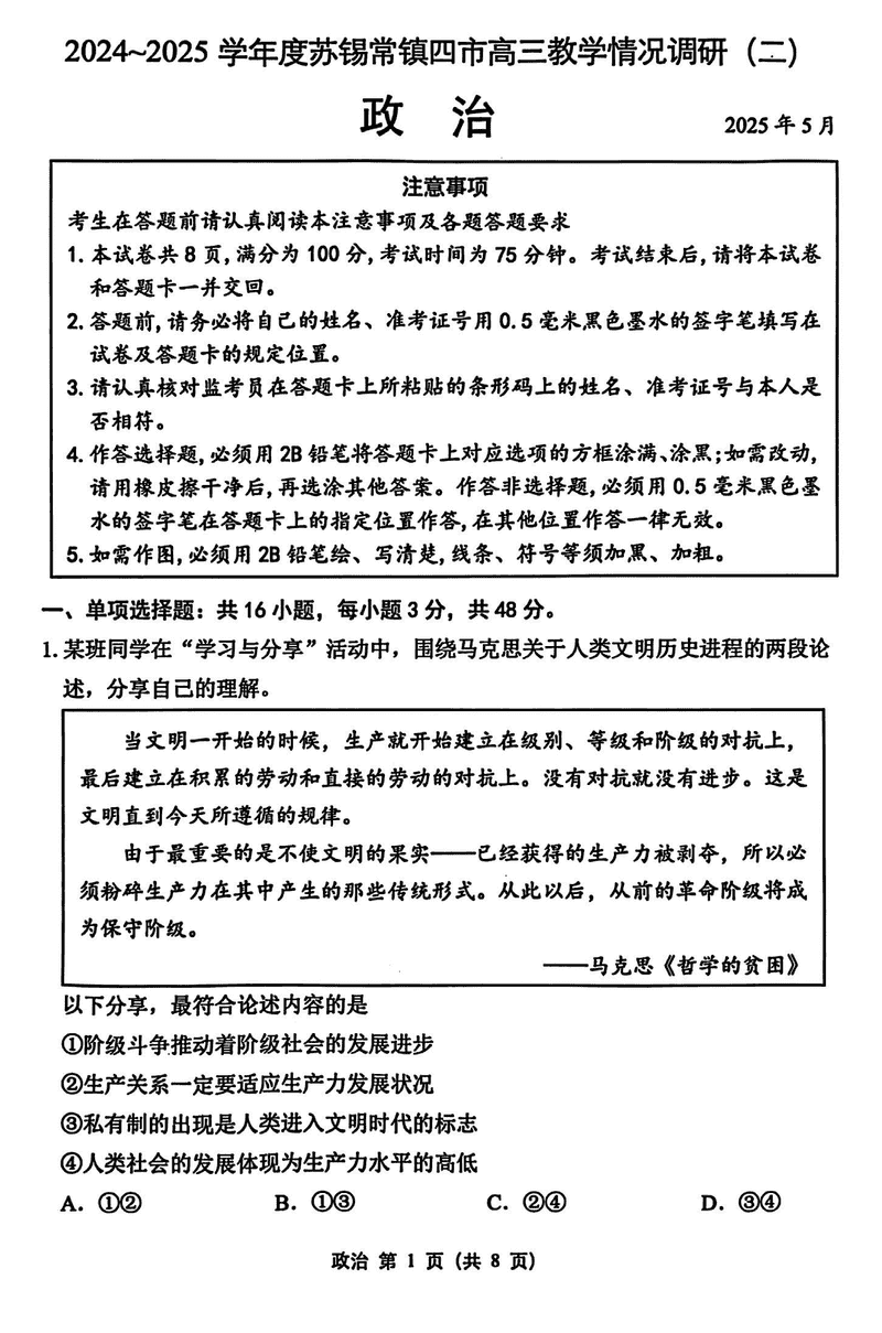 2024-2025学年苏锡常镇四市高三5月教学情况调研(二)政治考试已于近日开考,为方便考生考后及时查看考试情况,查漏补缺、弥补不足,本文整理了试题答案解析相关信息!