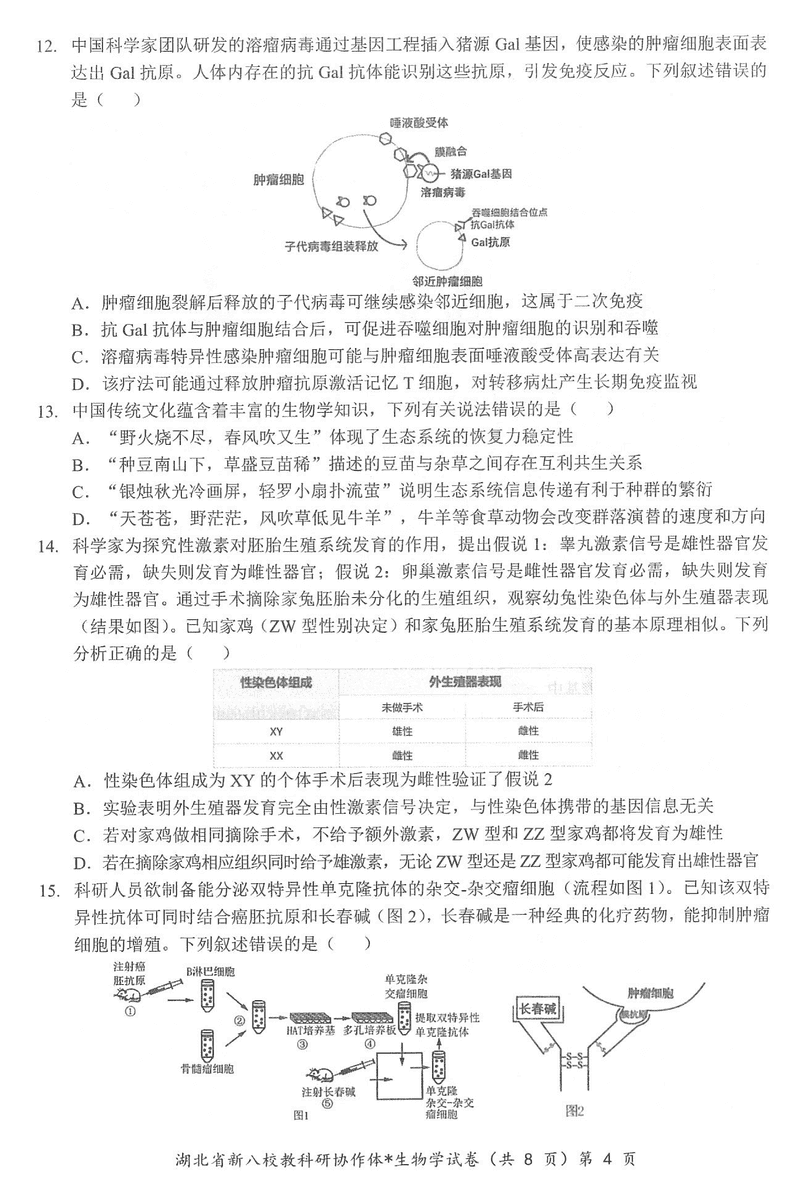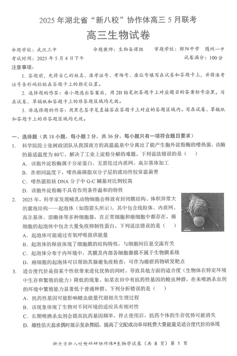 2025年湖北省新八校协作体高三5月联考生物试题及答案