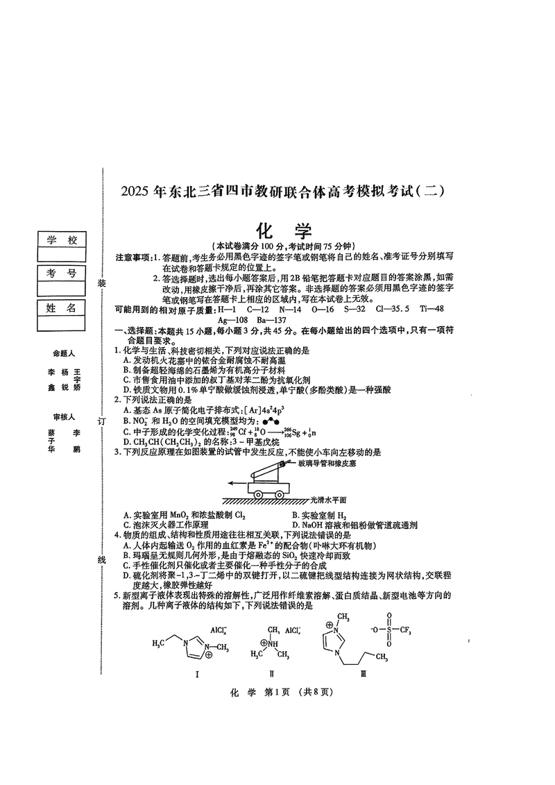 东北三省四市教研联合体2025年高考模拟试题(二)化学试题及答案