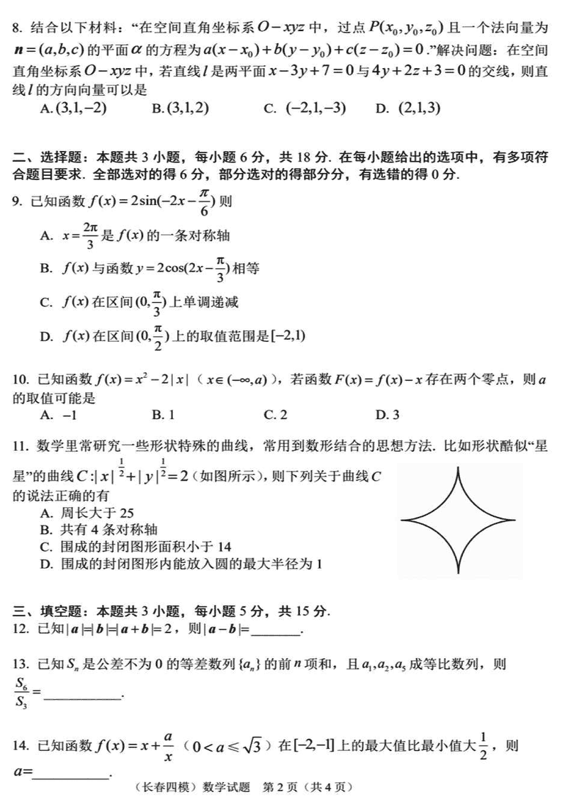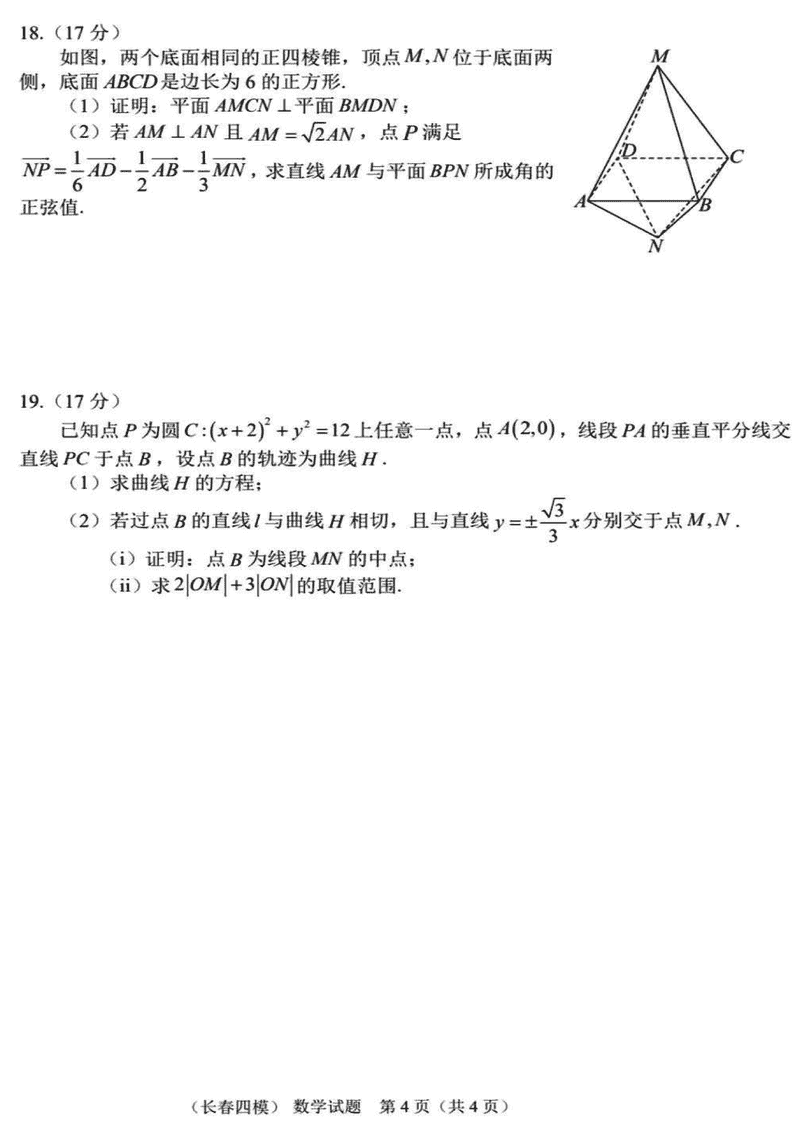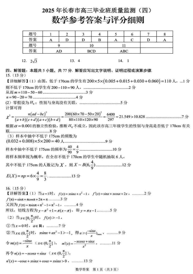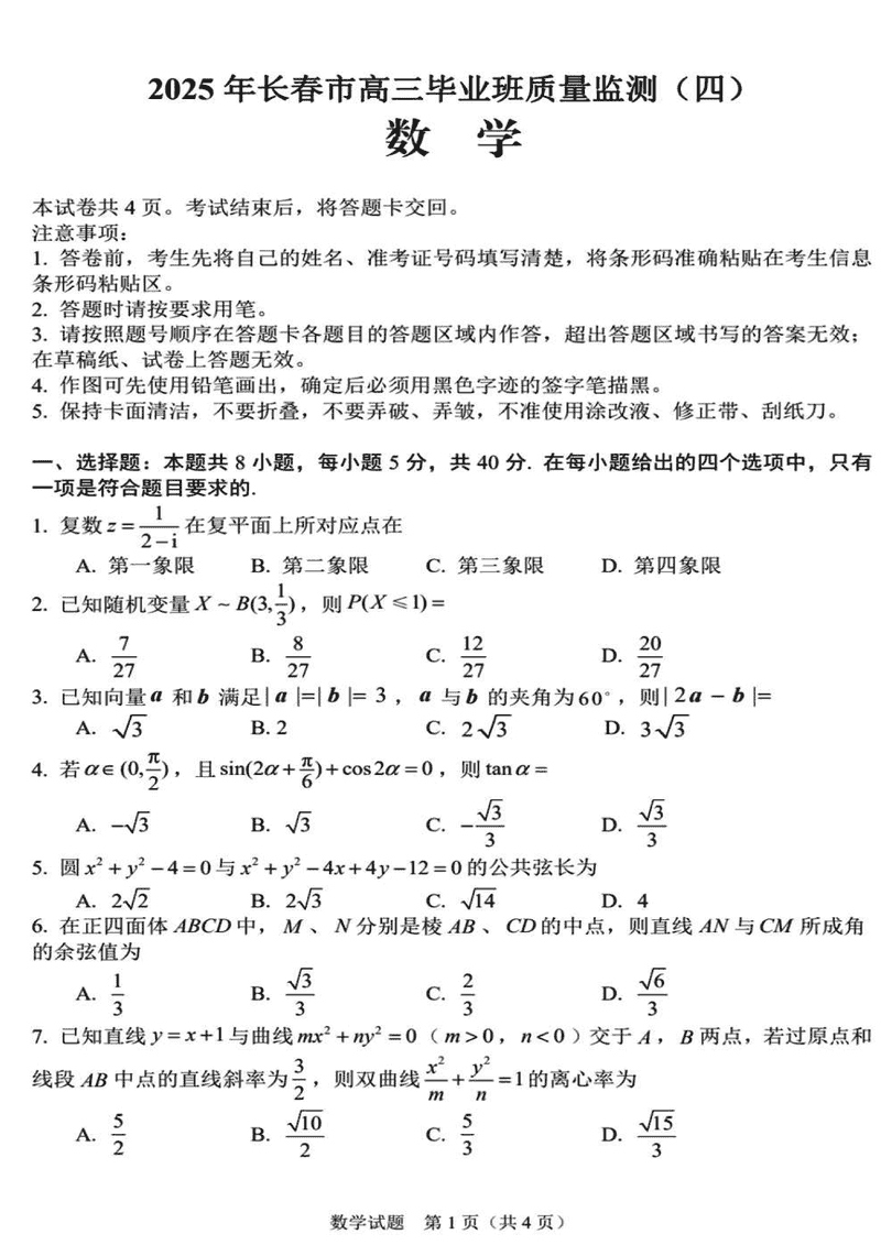 长春四模2025届高三质量监测(四)数学试题及答案 时间:2025-05-11 吉林 数学试题 长春四模2025届高三质量监测(四)数学考试已于近日开考,为方便考生考后及时查看考试情况,查漏补缺、弥补不足,本文整理了试题答案解析相关信息! 汇总:长春四模2025届高三质量监测(四)试题及答案汇总 数学试题及答案解析