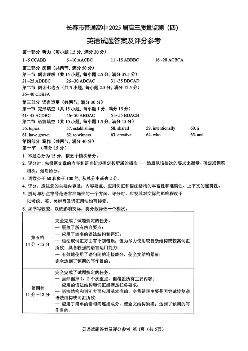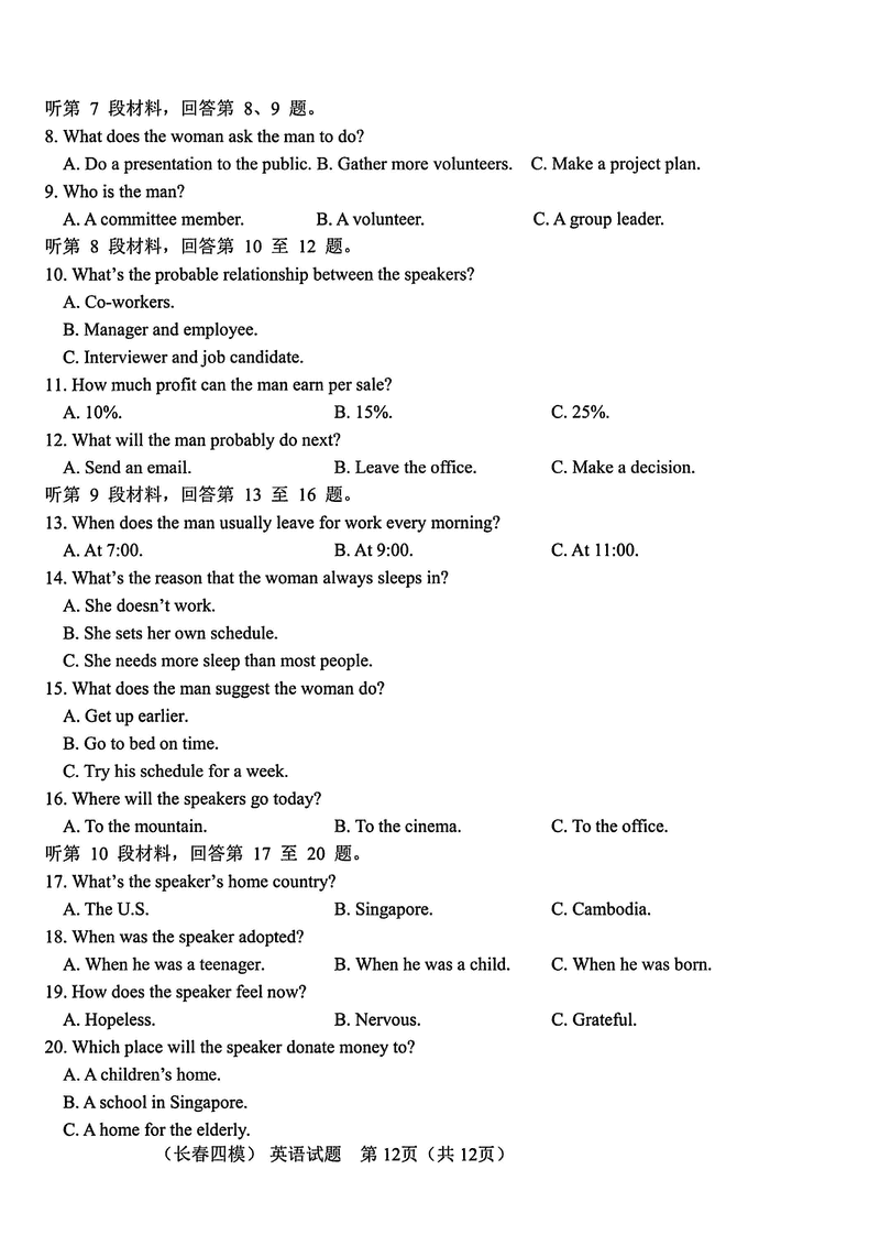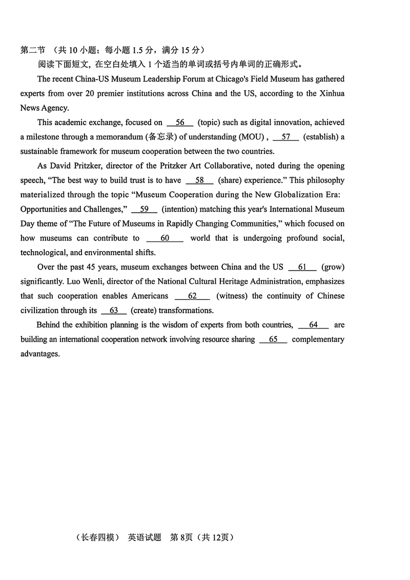 长春四模2025届高三质量监测(四)英语试题及答案 时间:2025-05-11 吉林 英语试题 长春四模2025届高三质量监测(四)英语考试已于近日开考,为方便考生考后及时查看考试情况,查漏补缺、弥补不足,本文整理了试题答案解析相关信息! 汇总:长春四模2025届高三质量监测(四)试题及答案汇总 英语试题及答案解析