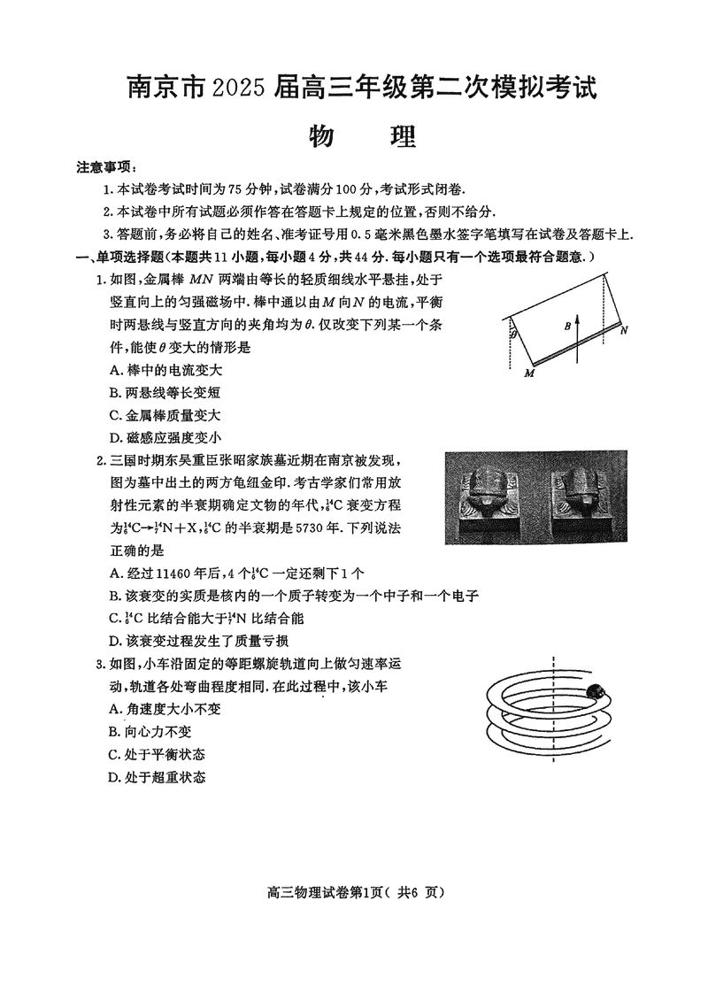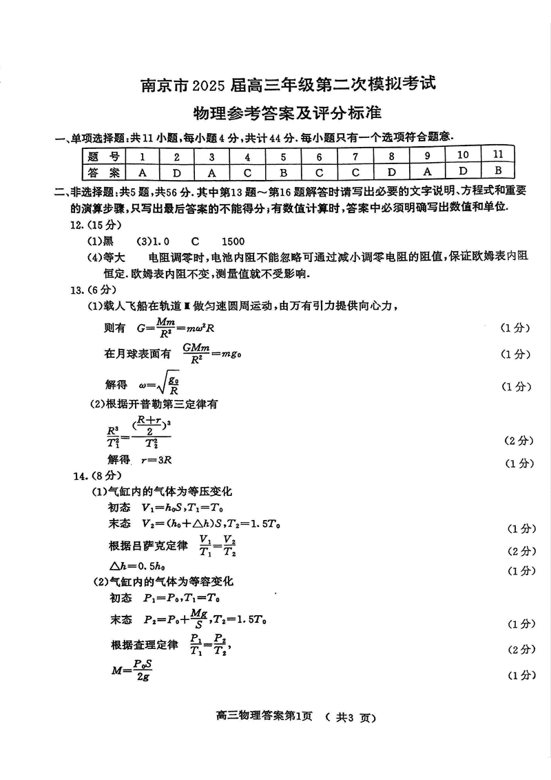 南京市2025届高三第二次模考物理试题及答案