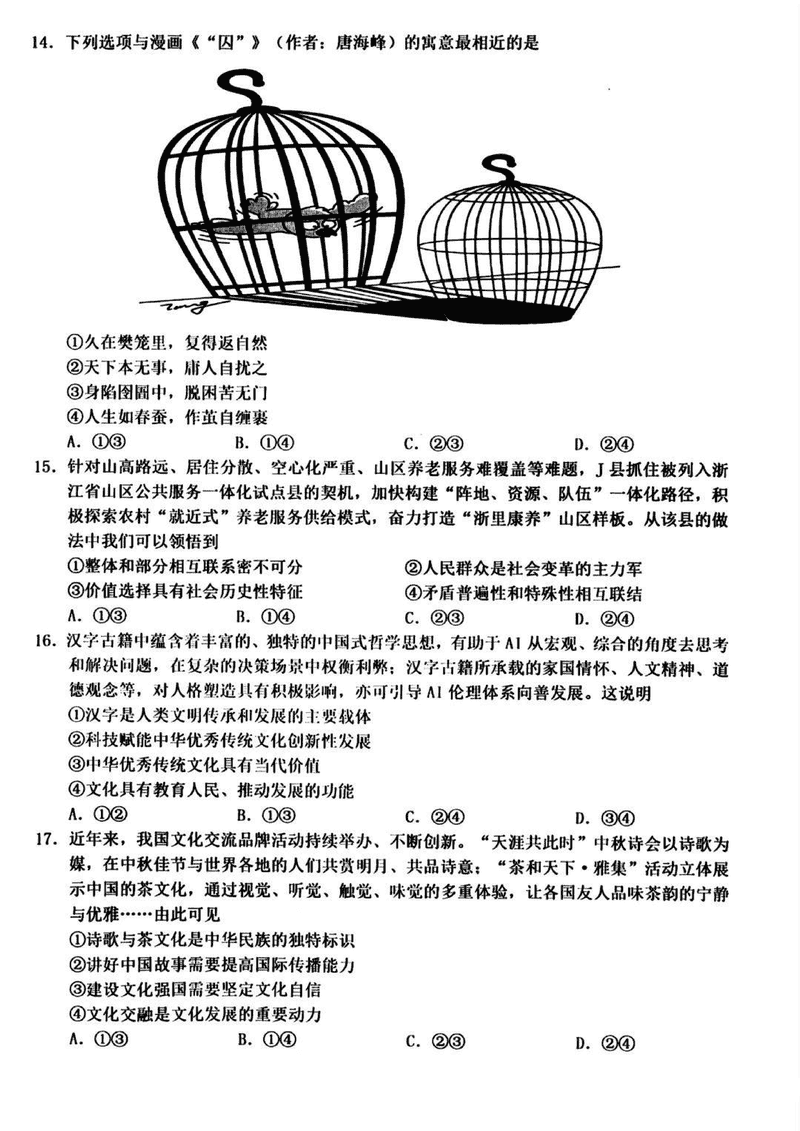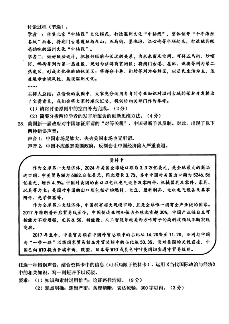 温州三模2025届高三第三次适应性考政治试题及答案 时间:2025-05-12 浙江 文综试题 温州三模2025届高三第三次适应性考政治考试已于近日开考,为方便考生考后及时查看考试情况,查漏补缺、弥补不足,本文整理了试题答案解析相关信息! 汇总:温州三模2025届高三第三次适应性考试试题及答案汇总 政治试题及答案解析