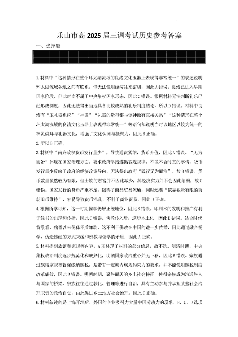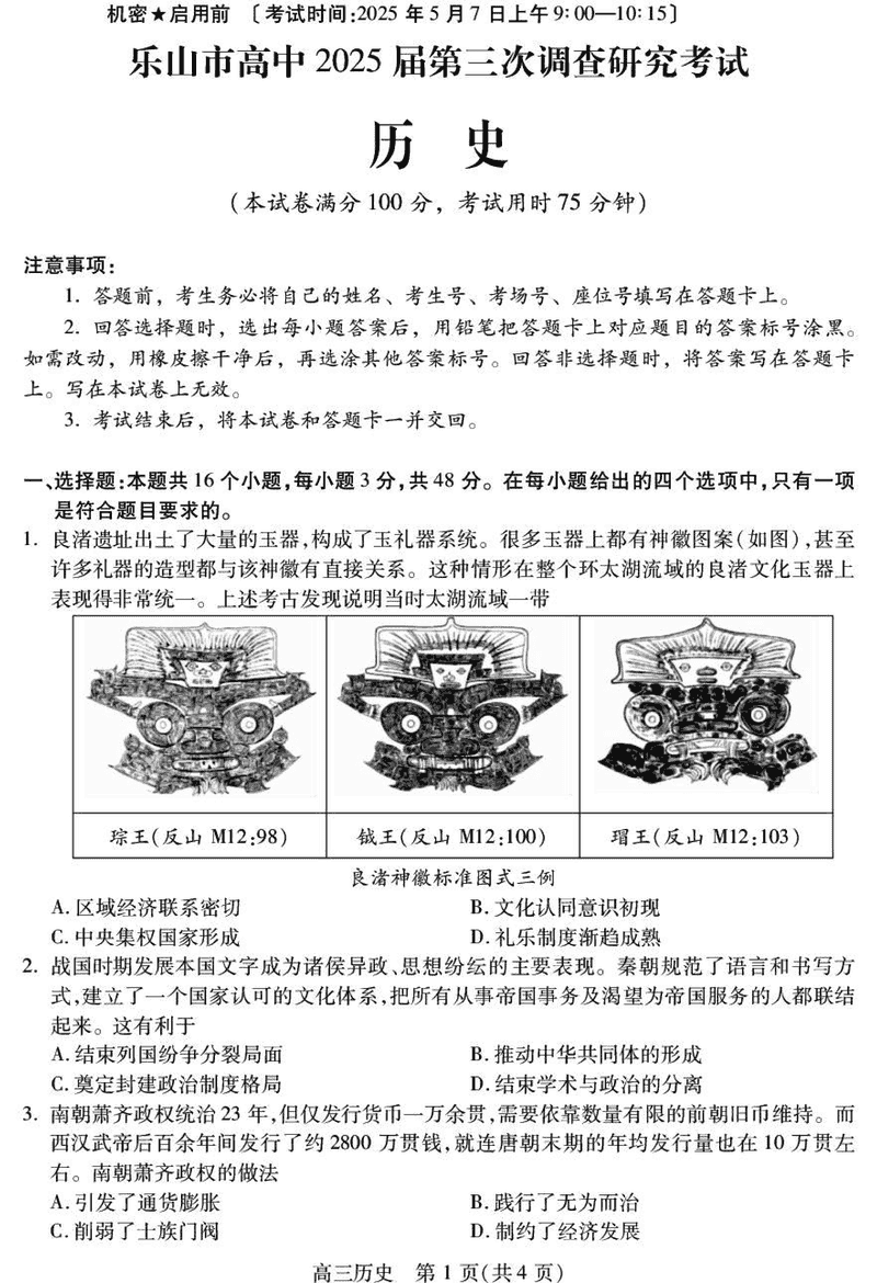 乐山市2025届高三下第三次调查研究历史考试已于近日开考,为方便考生考后及时查看考试情况,查漏补缺、弥补不足,本文整理了试题答案解析相关信息!