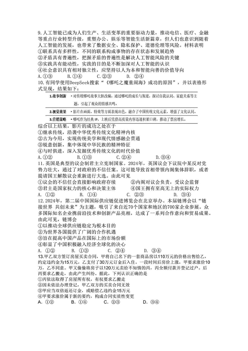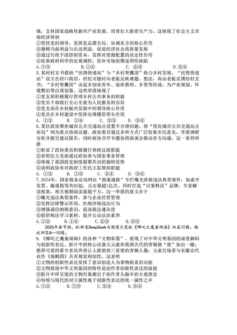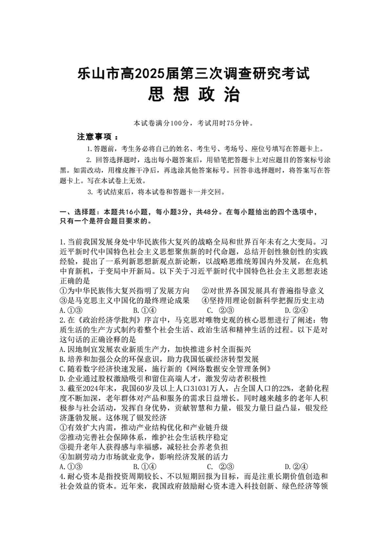 乐山市2025届高三下第三次调查研究政治试题及答案