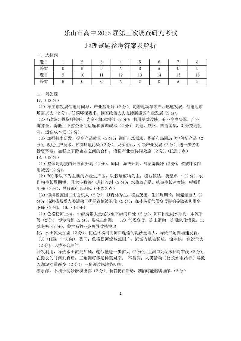 乐山市2025届高三下第三次调查研究地理考试已于近日开考,为方便考生考后及时查看考试情况,查漏补缺、弥补不足,本文整理了试题答案解析相关信息!