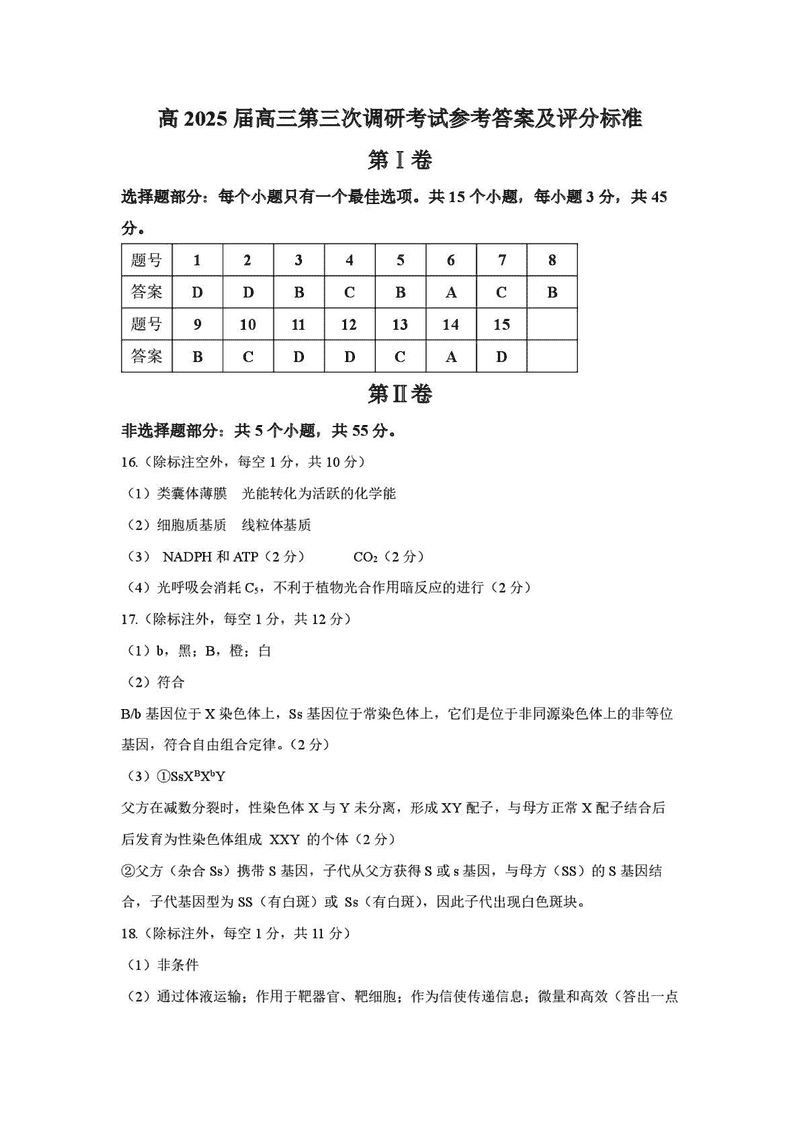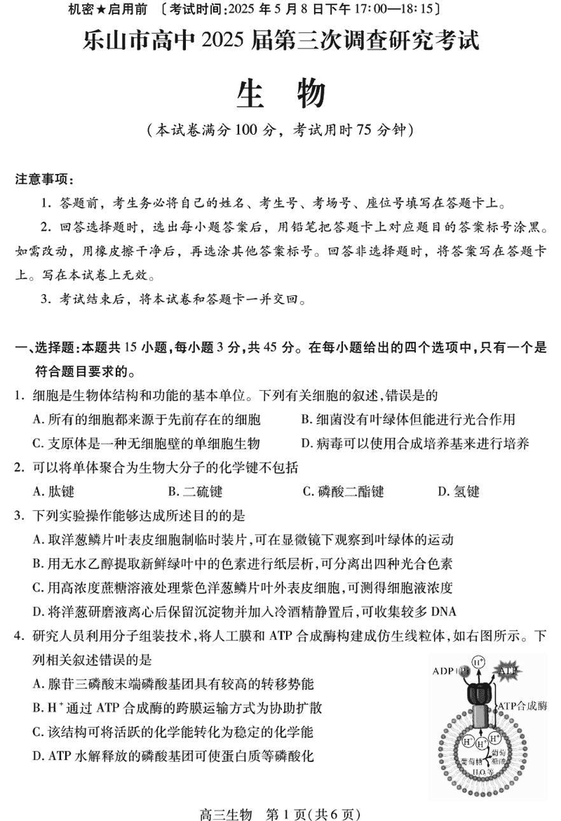 乐山市2025届高三下第三次调查研究生物试题及答案
