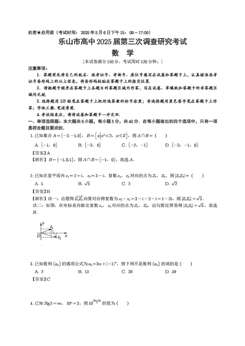 乐山市2025届高三下第三次调查研究数学考试已于近日开考,为方便考生考后及时查看考试情况,查漏补缺、弥补不足,本文整理了试题答案解析相关信息!