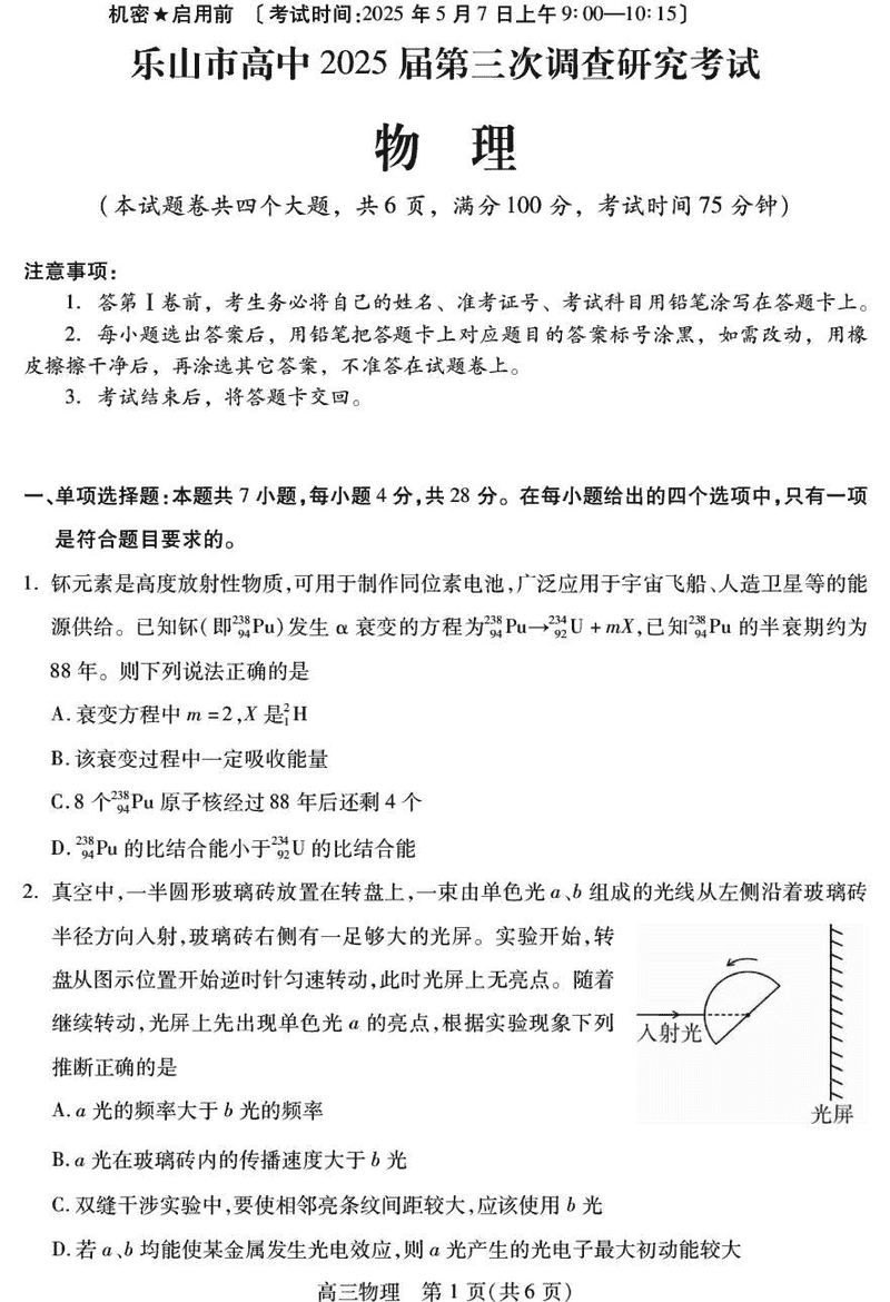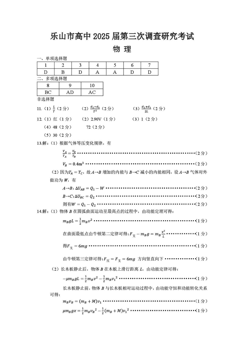 乐山市2025届高三下第三次调查研究物理考试已于近日开考,为方便考生考后及时查看考试情况,查漏补缺、弥补不足,本文整理了试题答案解析相关信息!