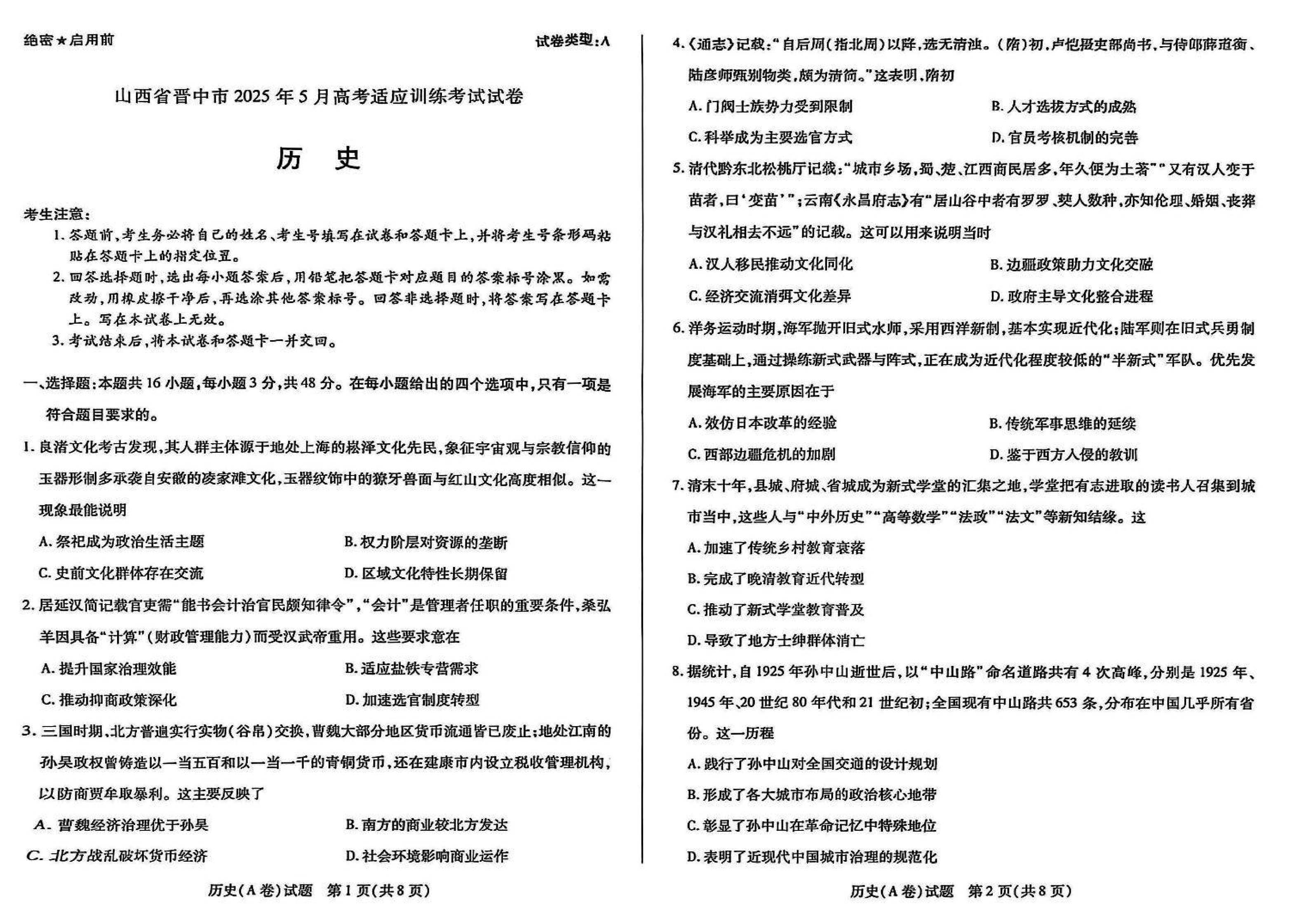 晋中三模2025年5月高考适应训练历史试题及答案 时间:2025-05-12 山西 文综试题 晋中三模2025年5月高考适应训练历史考试已于近日开考,为方便考生考后及时查看考试情况,查漏补缺、弥补不足,本文整理了试题答案解析相关信息! 汇总:晋中三模2025年5月高考适应训练考试试题及答案汇总 历史试题及答案解析