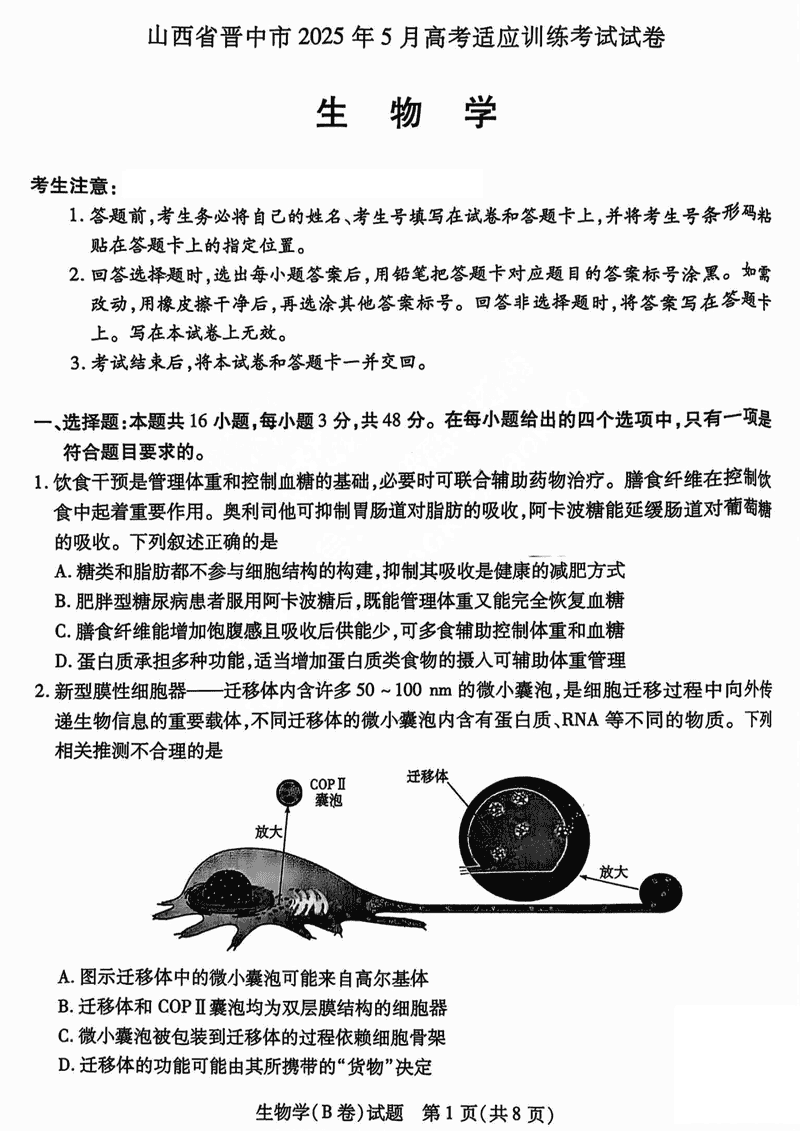 晋中三模2025年5月高考适应训练生物试题及答案 时间:2025-05-12 山西 理综试题 晋中三模2025年5月高考适应训练生物考试已于近日开考,为方便考生考后及时查看考试情况,查漏补缺、弥补不足,本文整理了试题答案解析相关信息! 汇总:晋中三模2025年5月高考适应训练考试试题及答案汇总 生物试题及答案解析