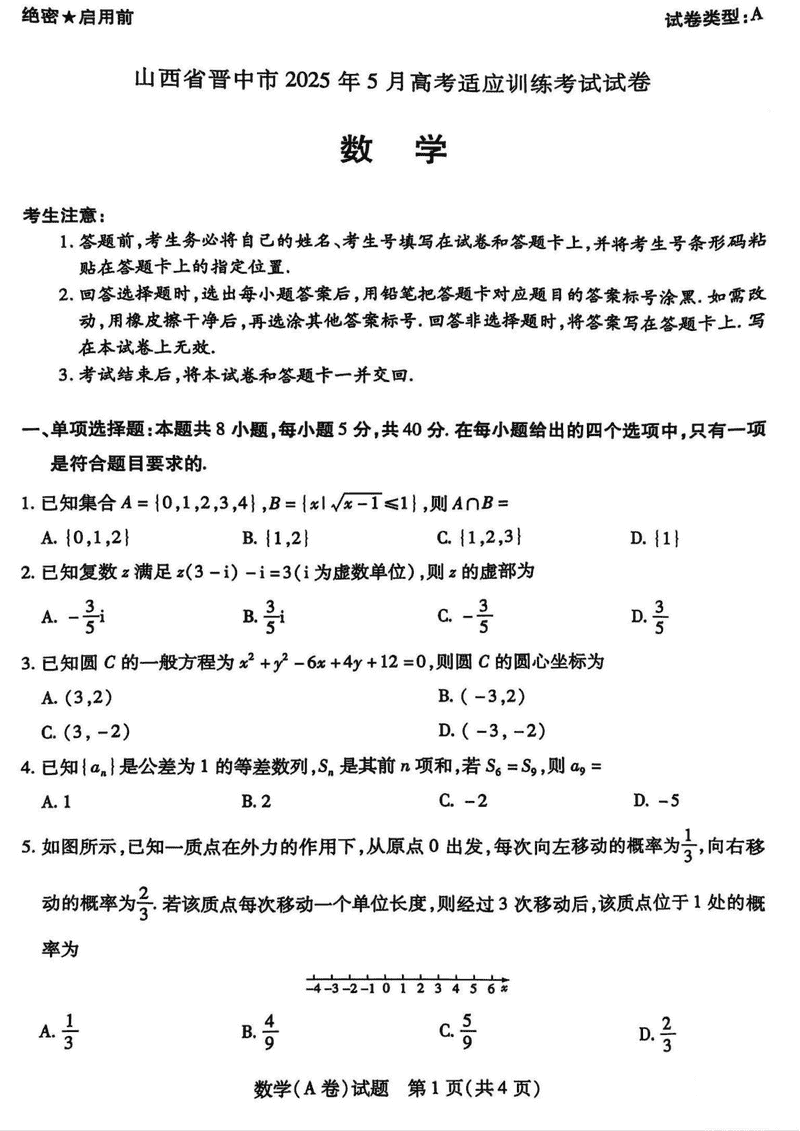 晋中三模2025年5月高考适应训练数学试题及答案 时间:2025-05-12 山西 数学试题 晋中三模2025年5月高考适应训练数学考试已于近日开考,为方便考生考后及时查看考试情况,查漏补缺、弥补不足,本文整理了试题答案解析相关信息! 汇总:晋中三模2025年5月高考适应训练考试试题及答案汇总 数学试题及答案解析