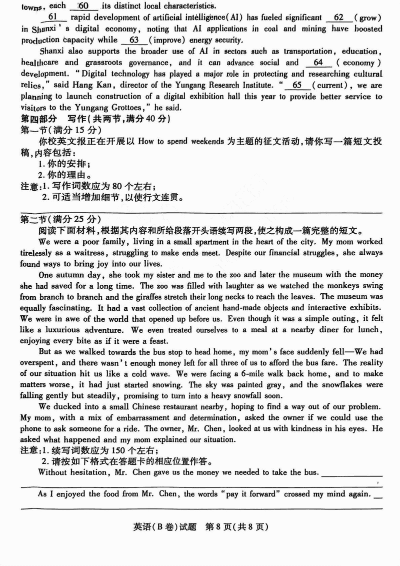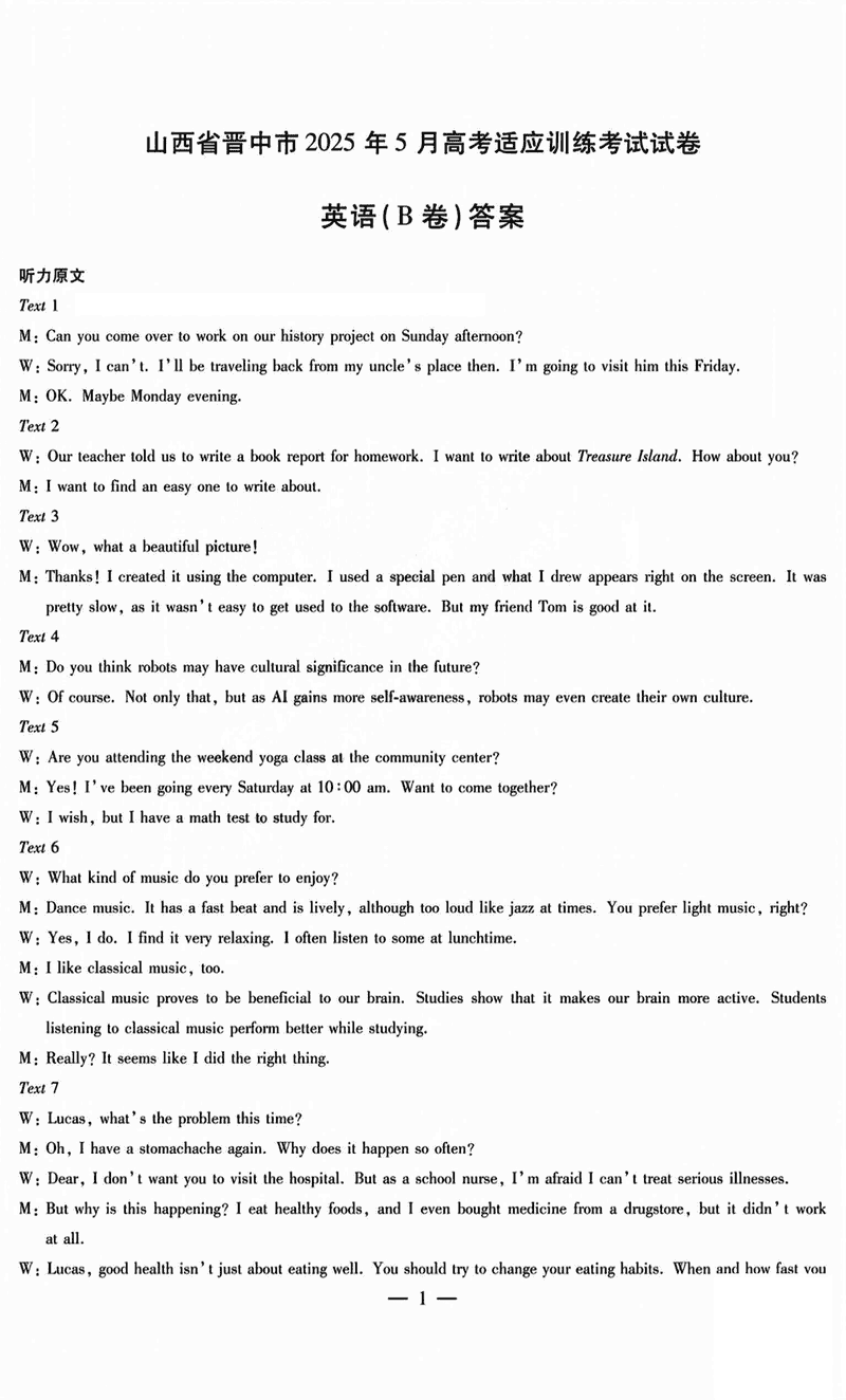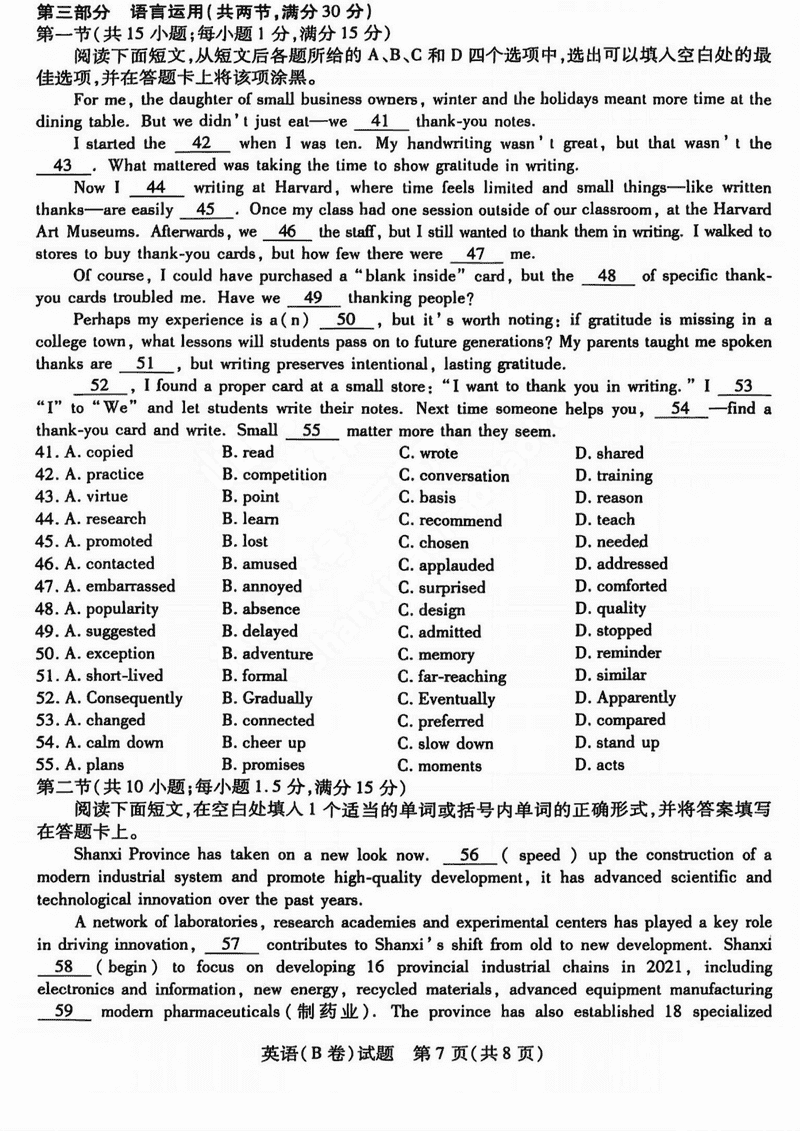 晋中三模2025年5月高考适应训练英语试题及答案 时间:2025-05-12 山西 英语试题 晋中三模2025年5月高考适应训练英语考试已于近日开考,为方便考生考后及时查看考试情况,查漏补缺、弥补不足,本文整理了试题答案解析相关信息! 汇总:晋中三模2025年5月高考适应训练考试试题及答案汇总 英语试题及答案解析