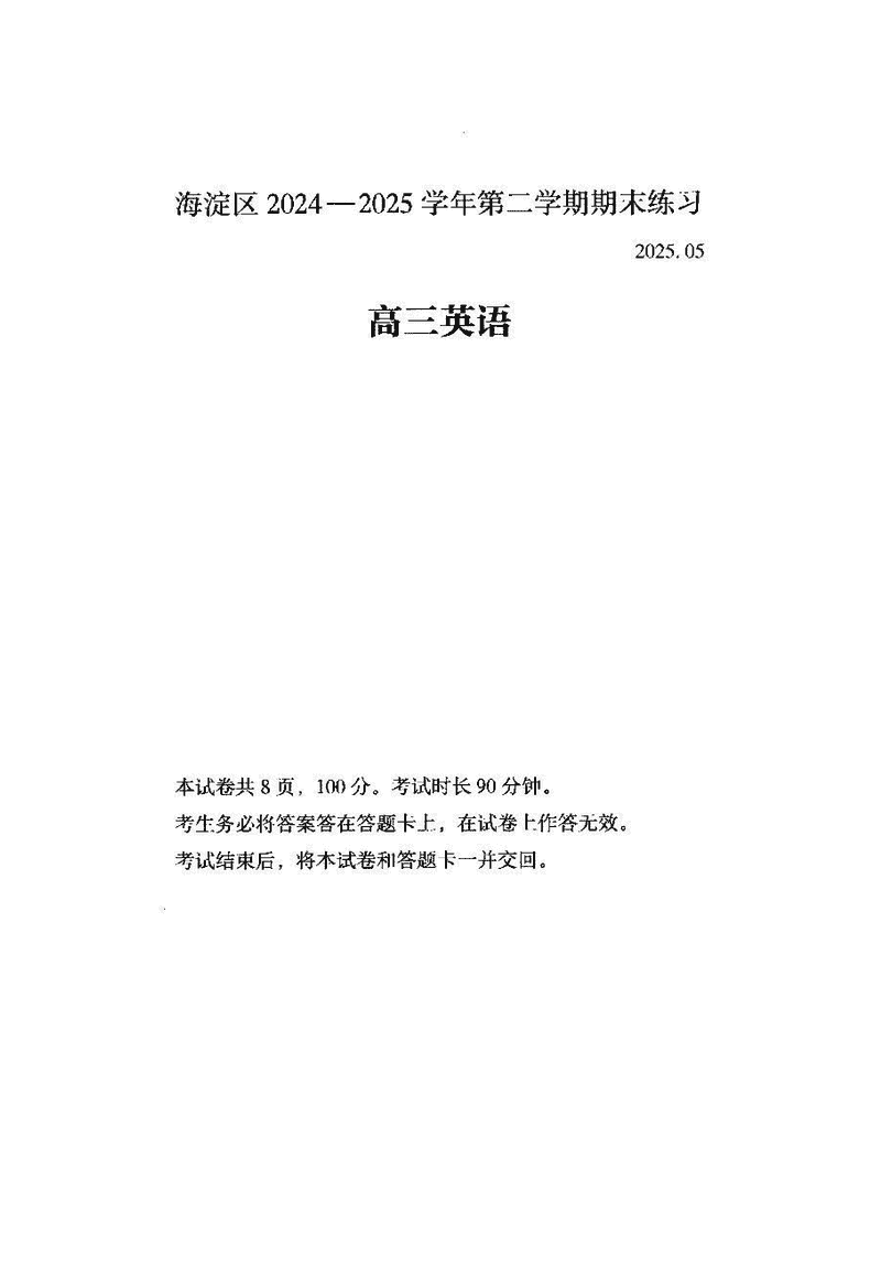 2025年北京市海淀区高三二模英语试题及答案 时间:2025-05-12 北京 英语试题 2025年北京市海淀区高三二模英语考试已于近日开考,为方便考生考后及时查看考试情况,查漏补缺、弥补不足,本文整理了试题答案解析相关信息! 汇总:2025年北京市海淀区高三二模试题及答案汇总 英语试题及答案解析