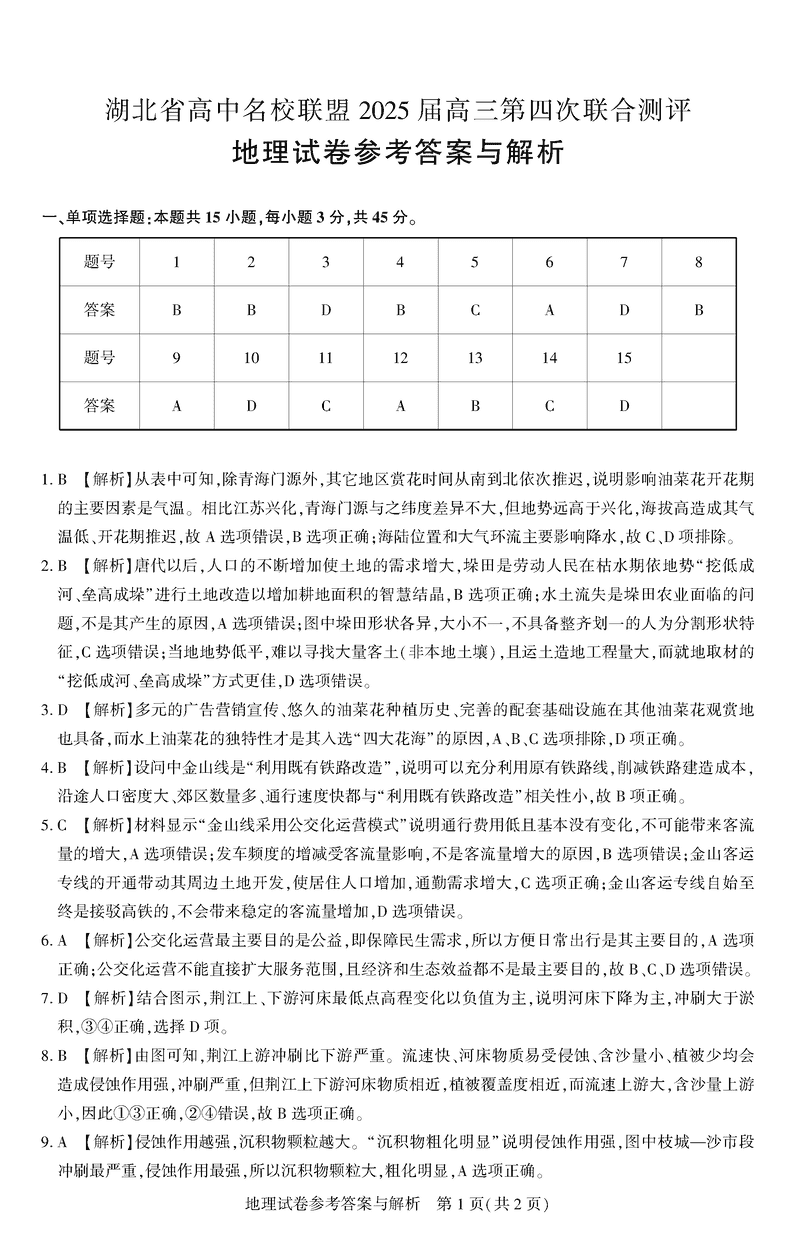湖北圆创名校联盟2025届高三第四次联合测评地理试题及答案