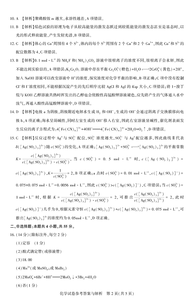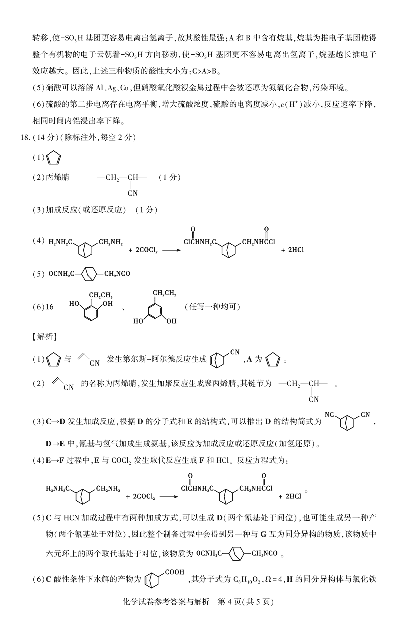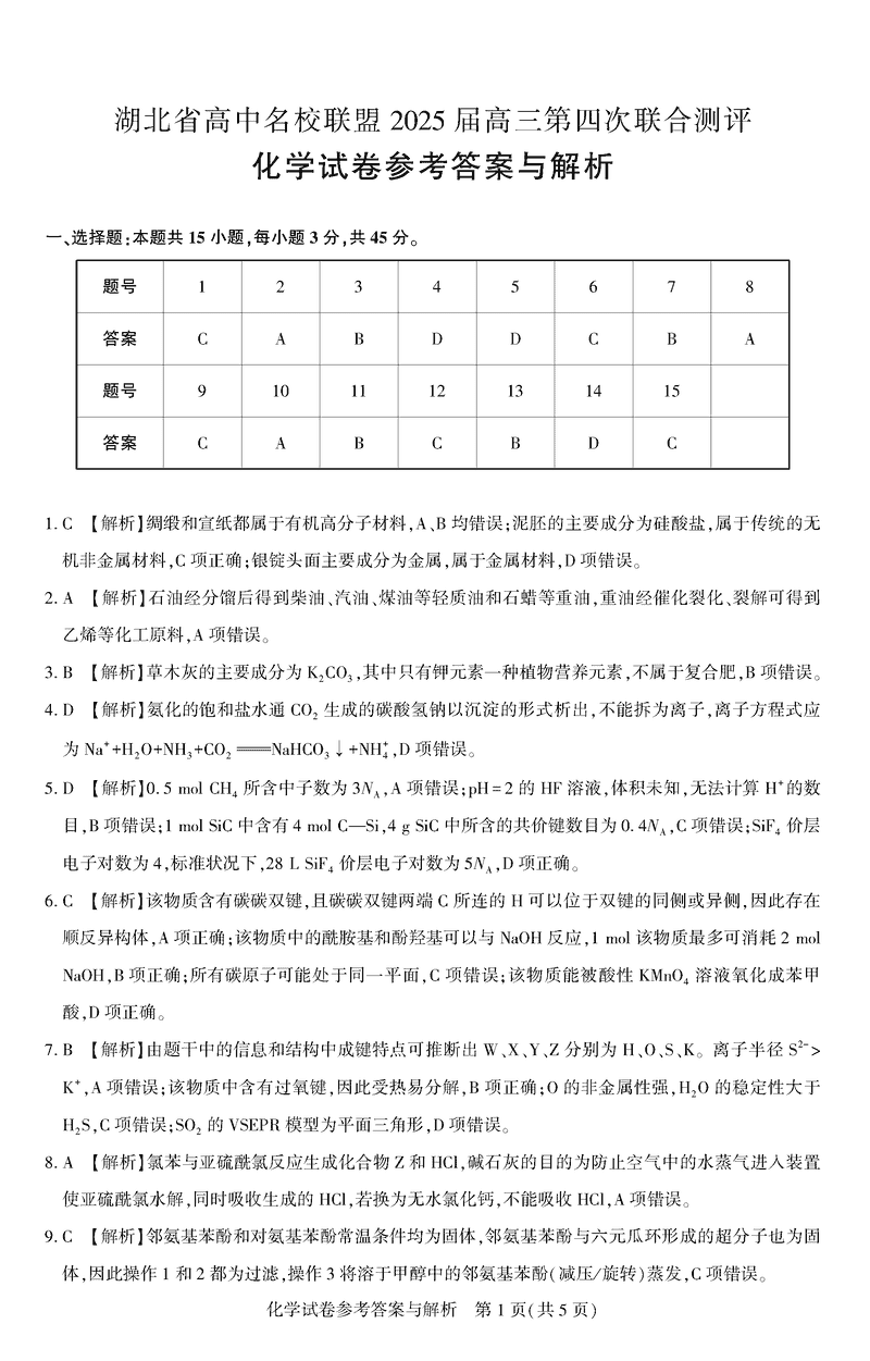 湖北圆创名校联盟2025届高三第四次联合测评化学试题及答案