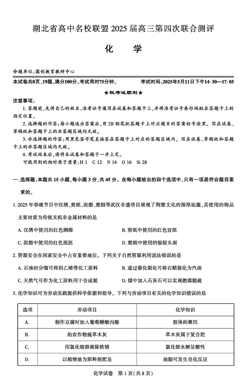 湖北圆创名校联盟2025届高三第四次联合测评化学考试已于近日开考,为方便考生考后及时查看考试情况,查漏补缺、弥补不足,本文整理了试题答案解析相关信息!