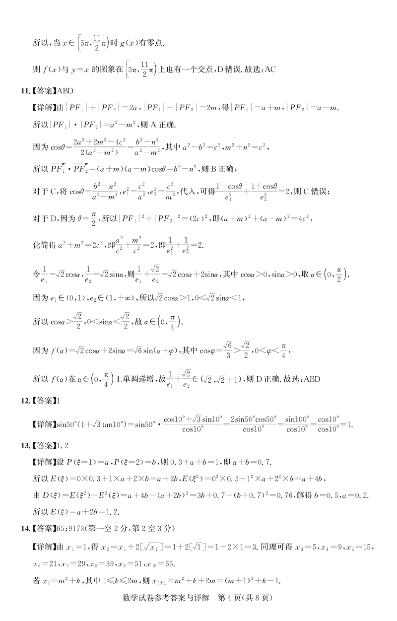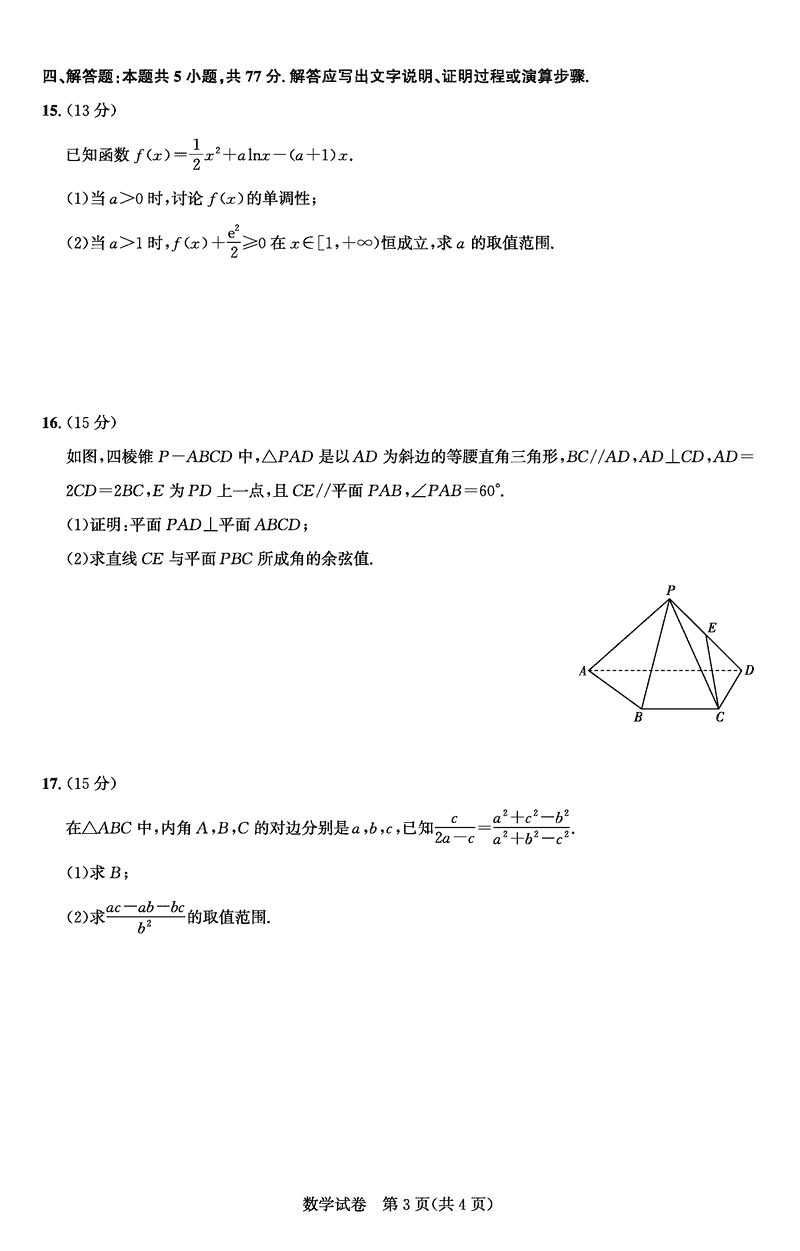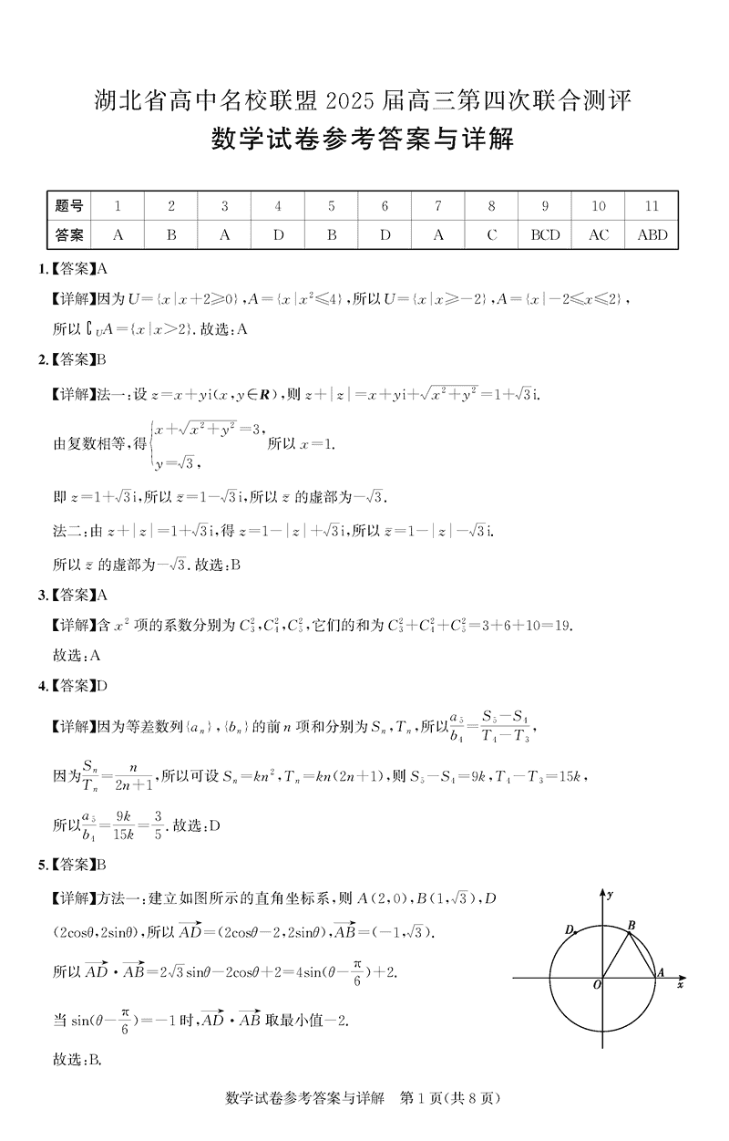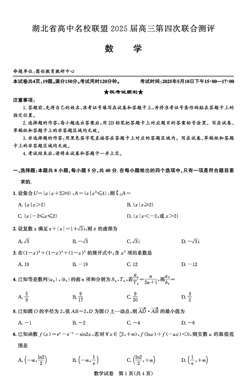 湖北圆创名校联盟2025届高三第四次联合测评数学试题及答案