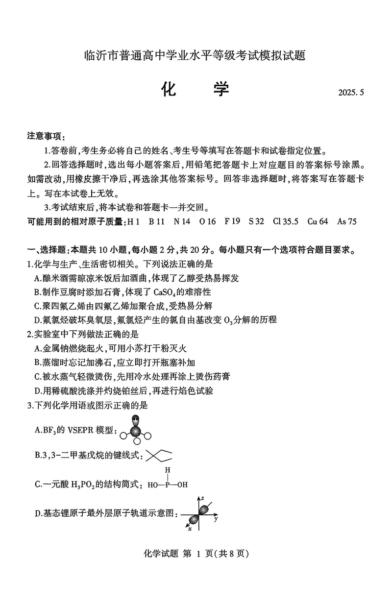 山东临沂2025高三二模化学试题及答案 时间:2025-05-14 山东 理综试题 山东临沂2025高三二模化学考试已于近日开考,为方便考生考后及时查看考试情况,查漏补缺、弥补不足,本文整理了试题答案解析相关信息! 汇总:山东临沂2025高三二模试题及答案汇总 化学试题及答案解析