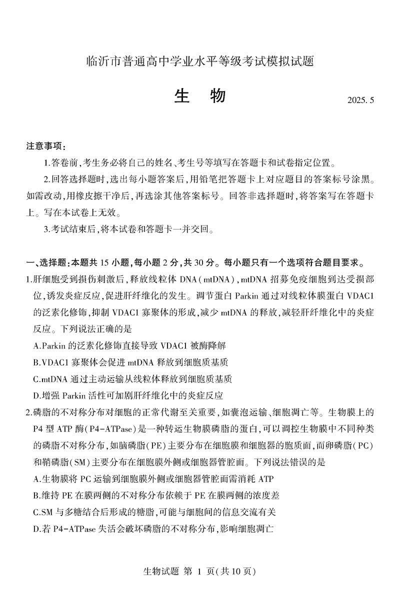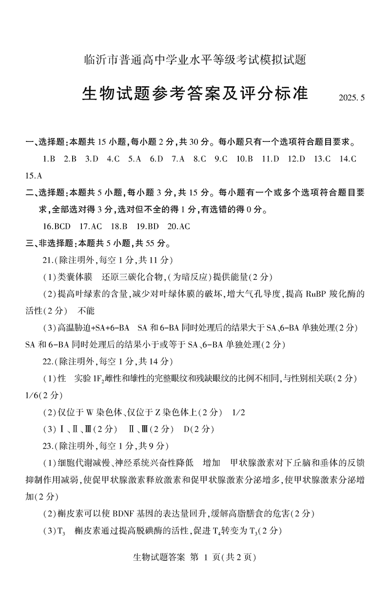 山东临沂2025高三二模生物试题及答案 时间:2025-05-14 山东 理综试题 山东临沂2025高三二模生物考试已于近日开考,为方便考生考后及时查看考试情况,查漏补缺、弥补不足,本文整理了试题答案解析相关信息! 汇总:山东临沂2025高三二模试题及答案汇总 生物试题及答案解析