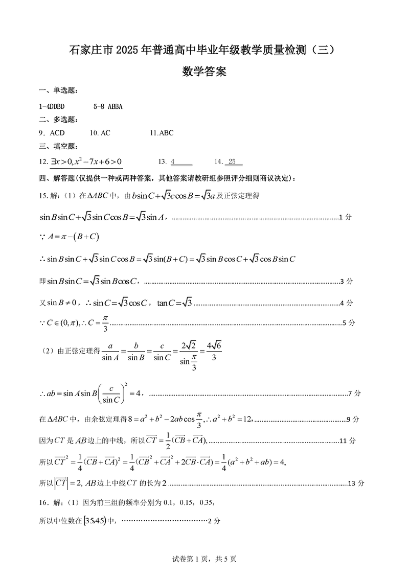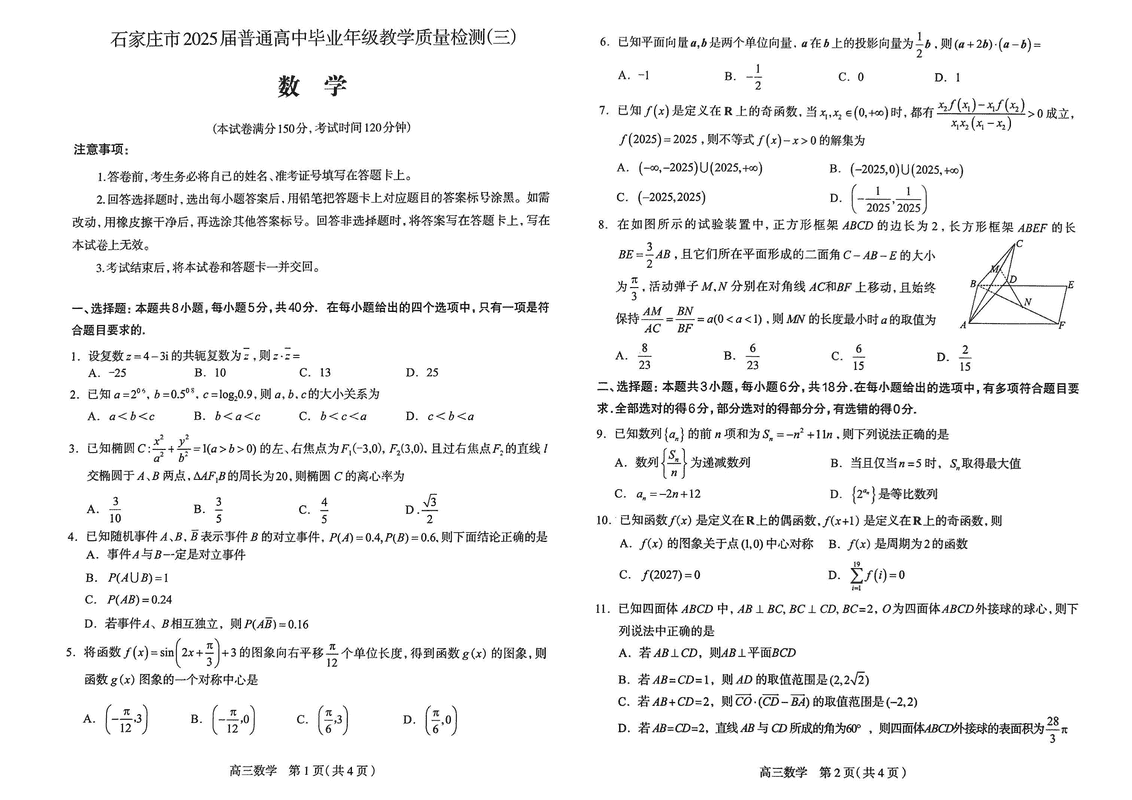 石家庄三模2025届高三教学质检三数学试题及答案 时间:2025-05-15 河北 数学试题 石家庄三模2025届高三教学质量检测三数学考试已于近日开考,为方便考生考后及时查看考试情况,查漏补缺、弥补不足,本文整理了试题答案解析相关信息! 汇总:石家庄三模2025届高三教学质量检测三试题及答案汇总 数学试题及答案解析