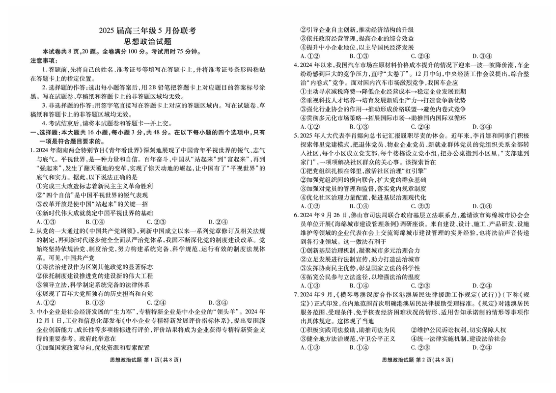 广东省衡水金卷2025届高三年级5月联考政治考试已于近日开考,为方便考生考后及时查看考试情况,查漏补缺、弥补不足,本文整理了试题答案解析相关信息!