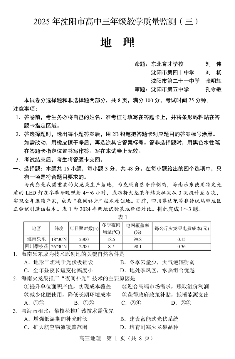 沈阳市2025届高三下教学质量监测(三)地理试题及答案