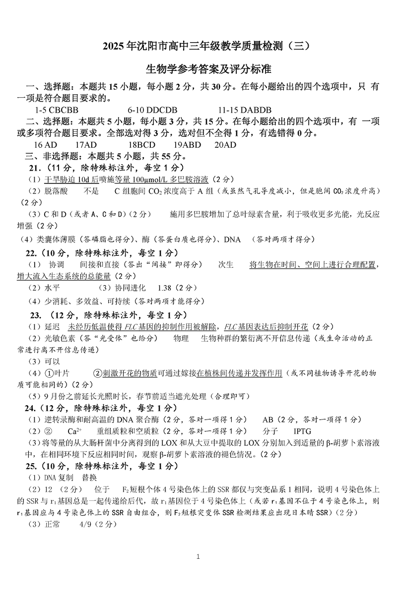 沈阳市2025届高三下教学质量监测(三)生物考试已于近日开考,为方便考生考后及时查看考试情况,查漏补缺、弥补不足,本文整理了试题答案解析相关信息!