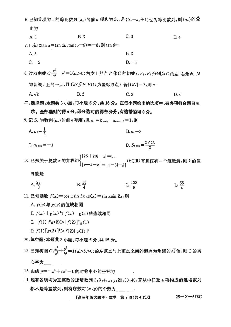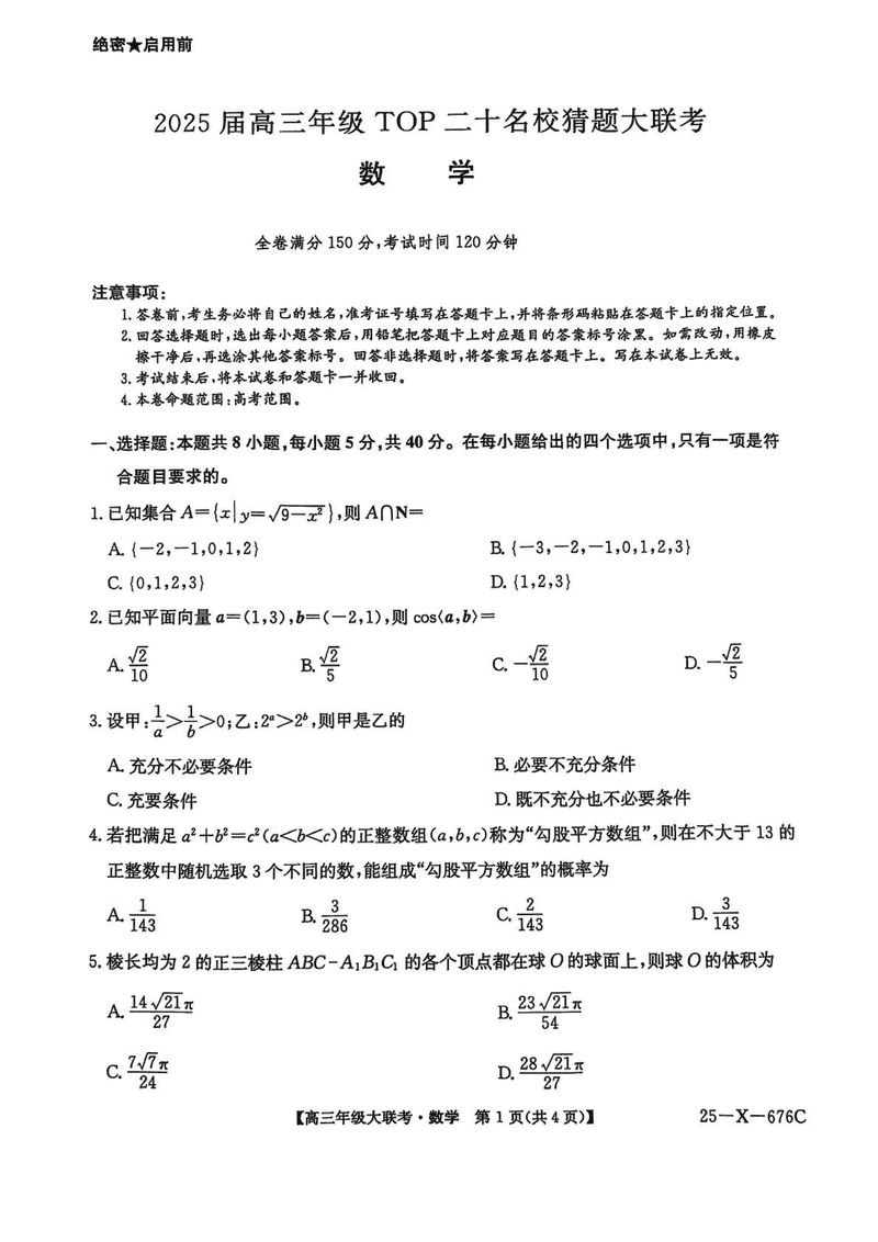 河南TOP二十名校2025届高三猜题大联考数学试题及答案