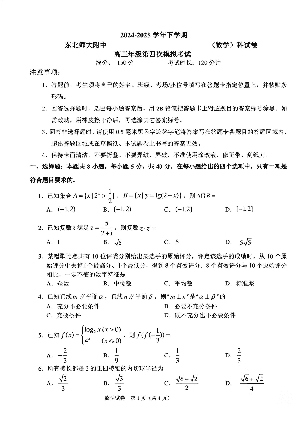 东北师大附中2025高三下学期第四次模考数学考试已于近日开考,为方便考生考后及时查看考试情况,查漏补缺、弥补不足,本文整理了试题答案解析相关信息!