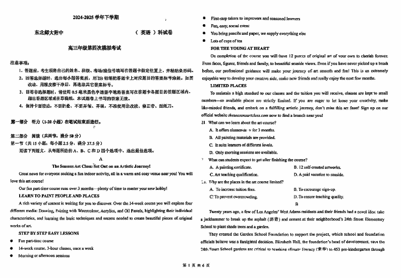 东北师大附中2025高三下学期第四次模考英语考试已于近日开考,为方便考生考后及时查看考试情况,查漏补缺、弥补不足,本文整理了试题答案解析相关信息!