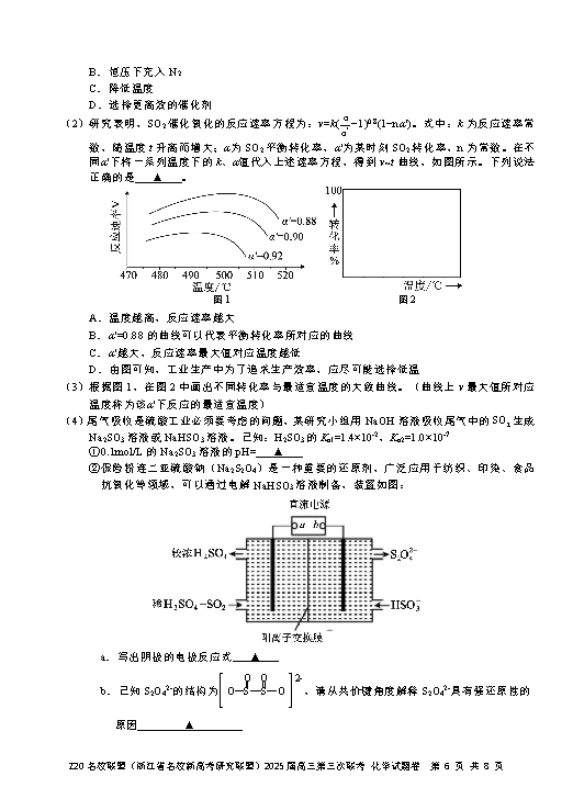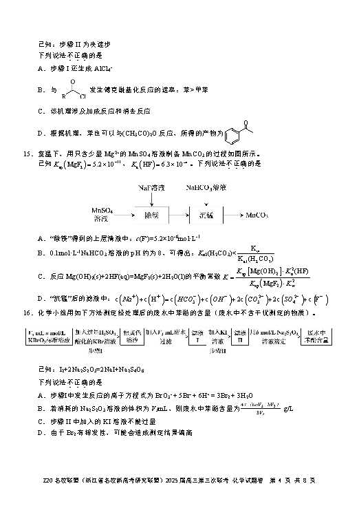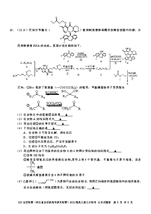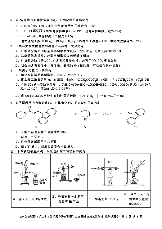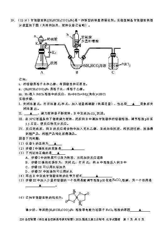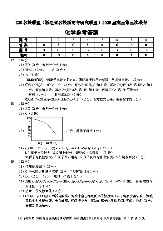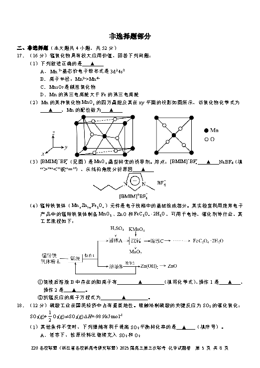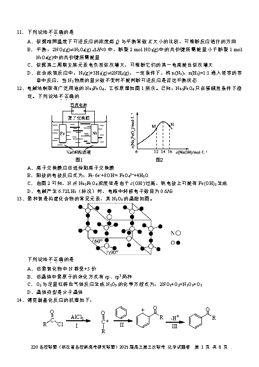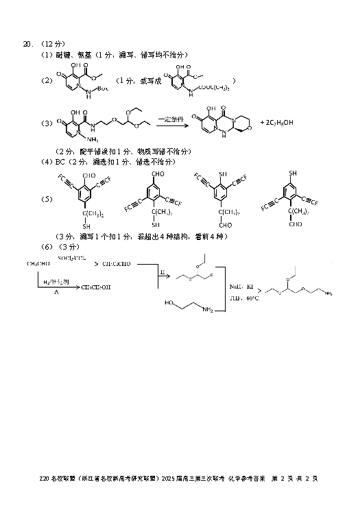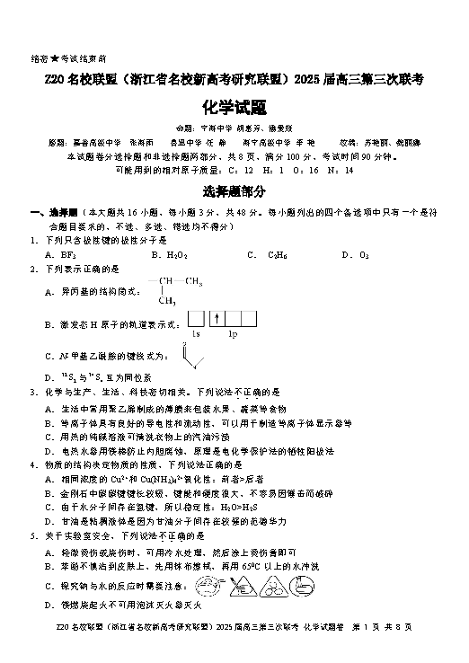 浙江Z20名校联盟2025届高三第三次联考化学试题及答案