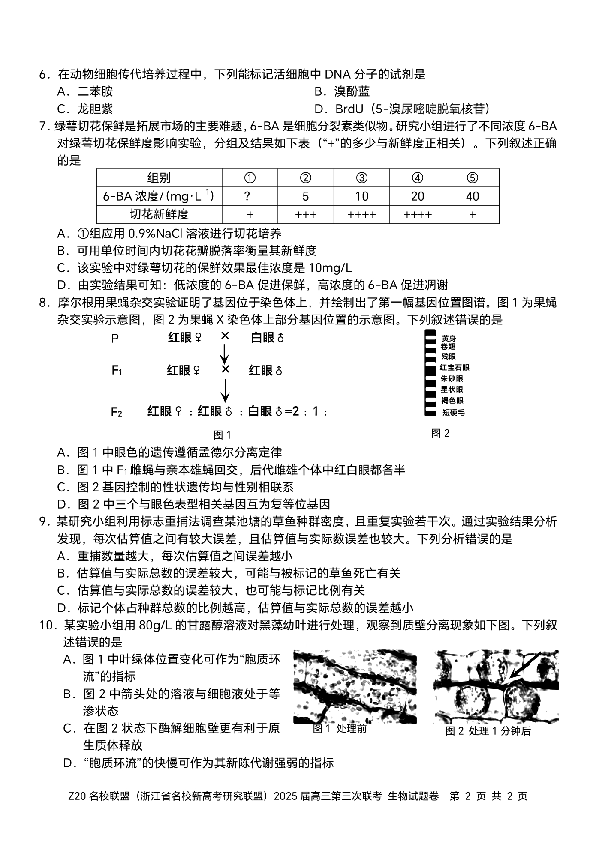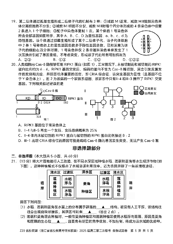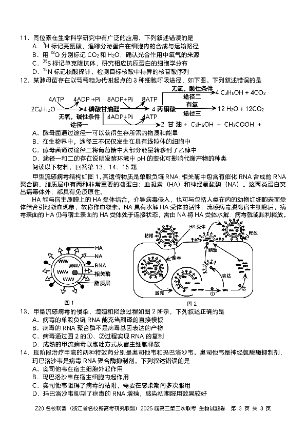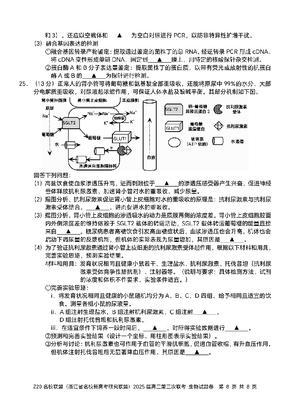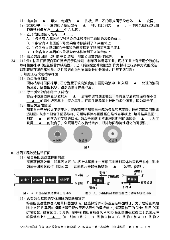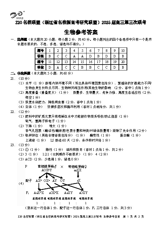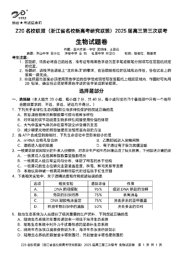 浙江Z20名校联盟2025届高三第三次联考生物试题及答案