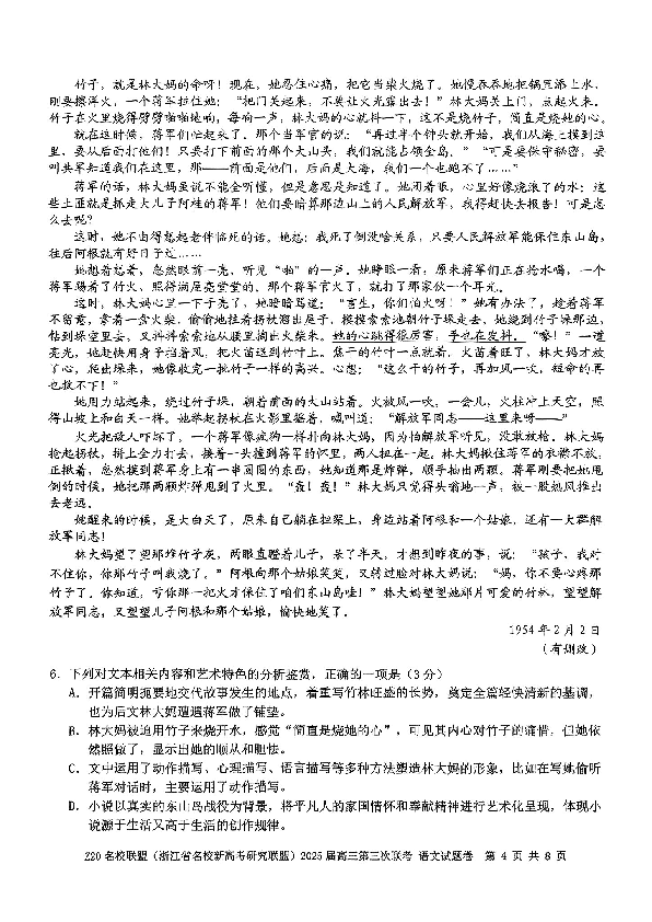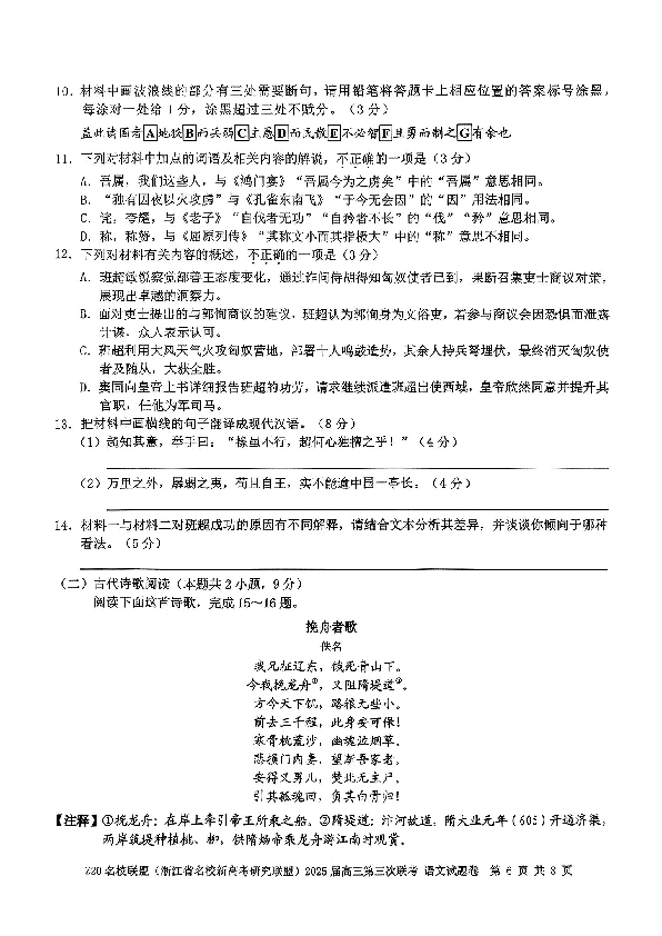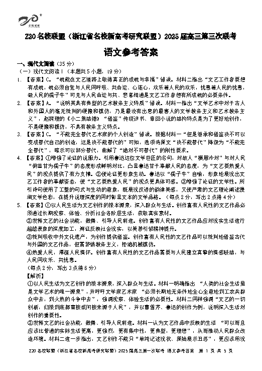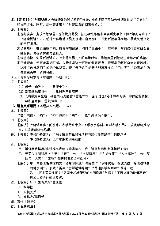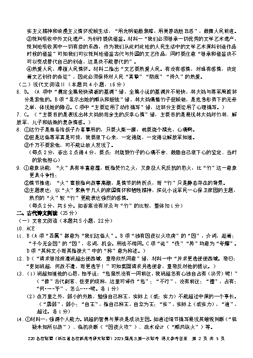 浙江Z20名校联盟2025届高三第三次联考语文试题及答案
