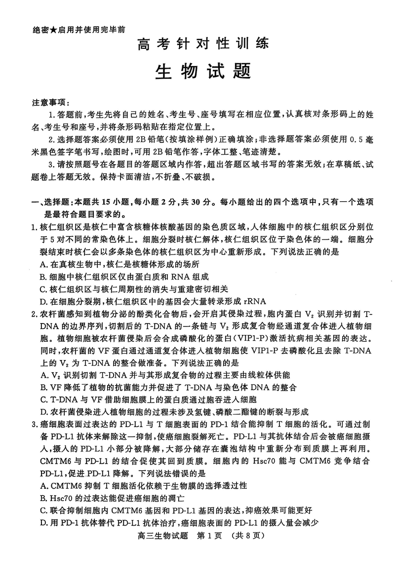 济南二模2025届高三5月针对性训练生物试题及答案 时间:2025-05-17 山东 理综试题 济南二模2025届高三下学期针对性训练生物考试已于近日开考,为方便考生考后及时查看考试情况,查漏补缺、弥补不足,本文整理了试题答案解析相关信息! 汇总:济南二模2025届高三下学期针对性训练试题及答案汇总 生物试题及答案解析