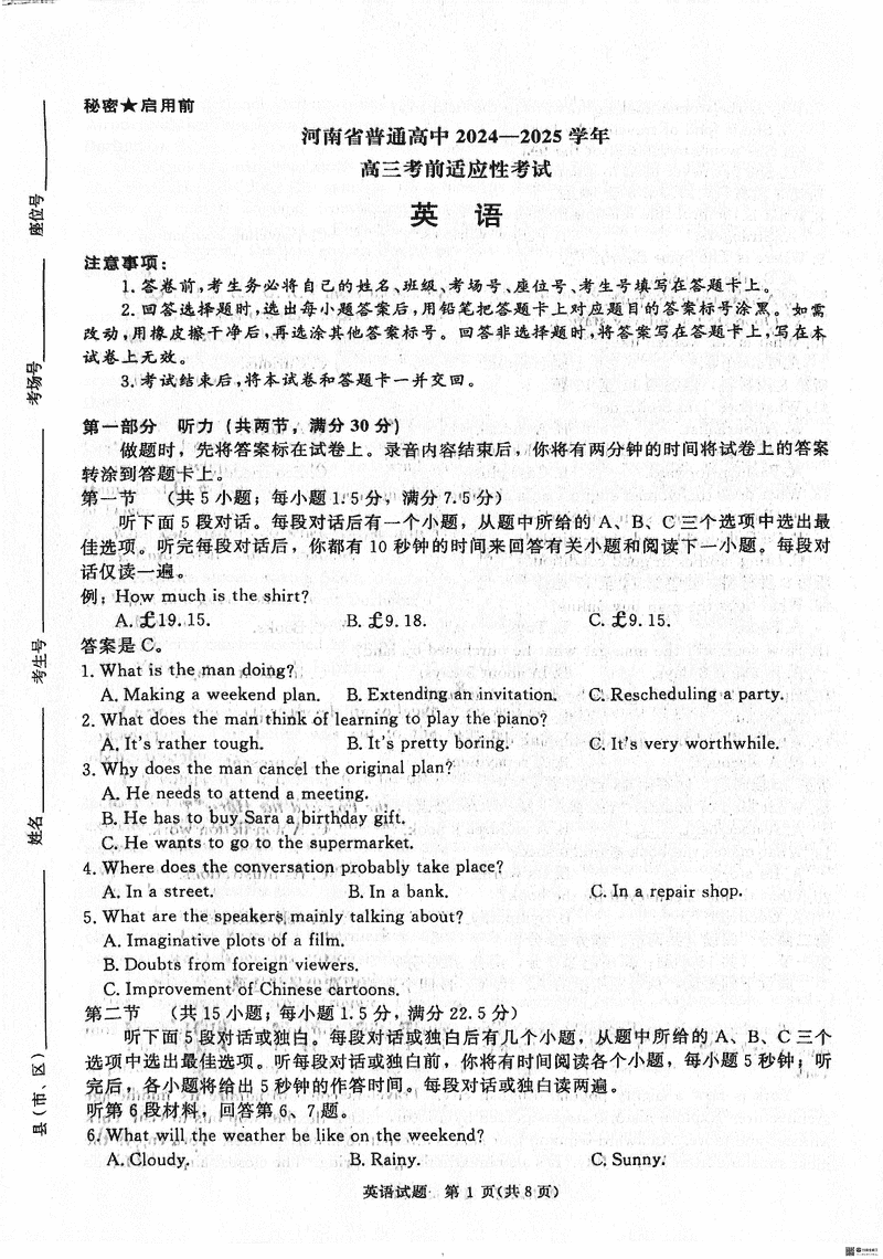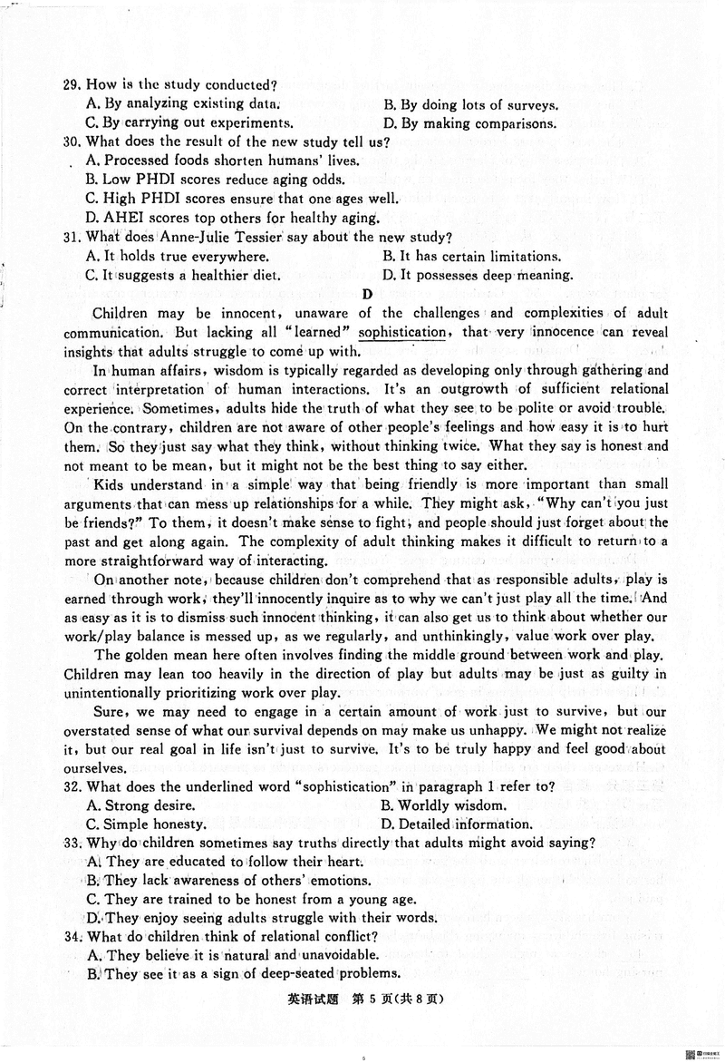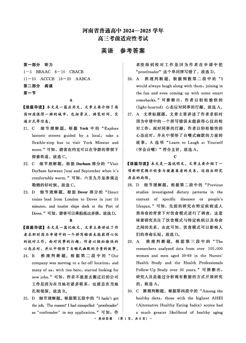 2025届河南青桐鸣5月高三考前适应性考英语试题及答案