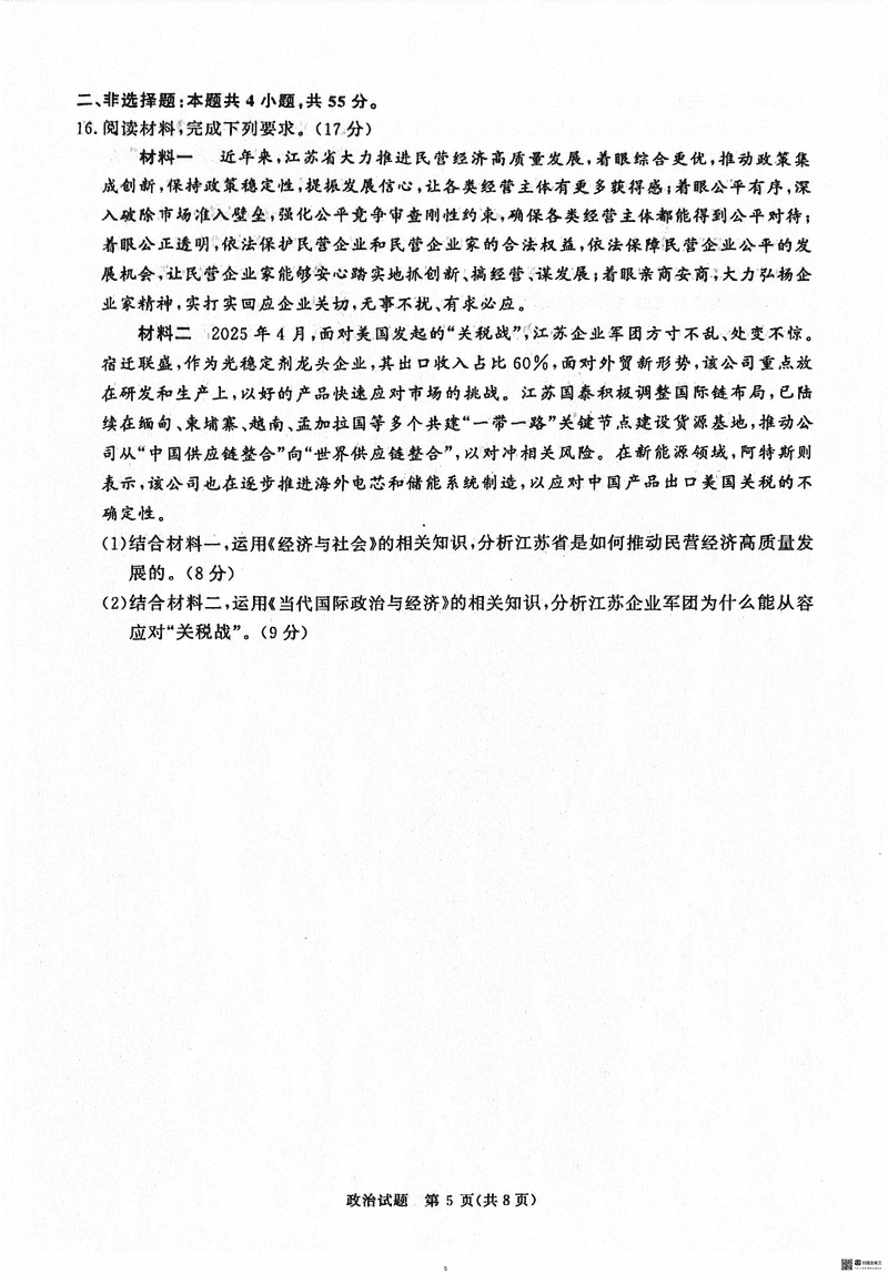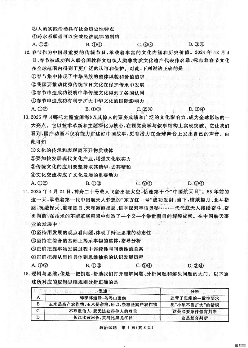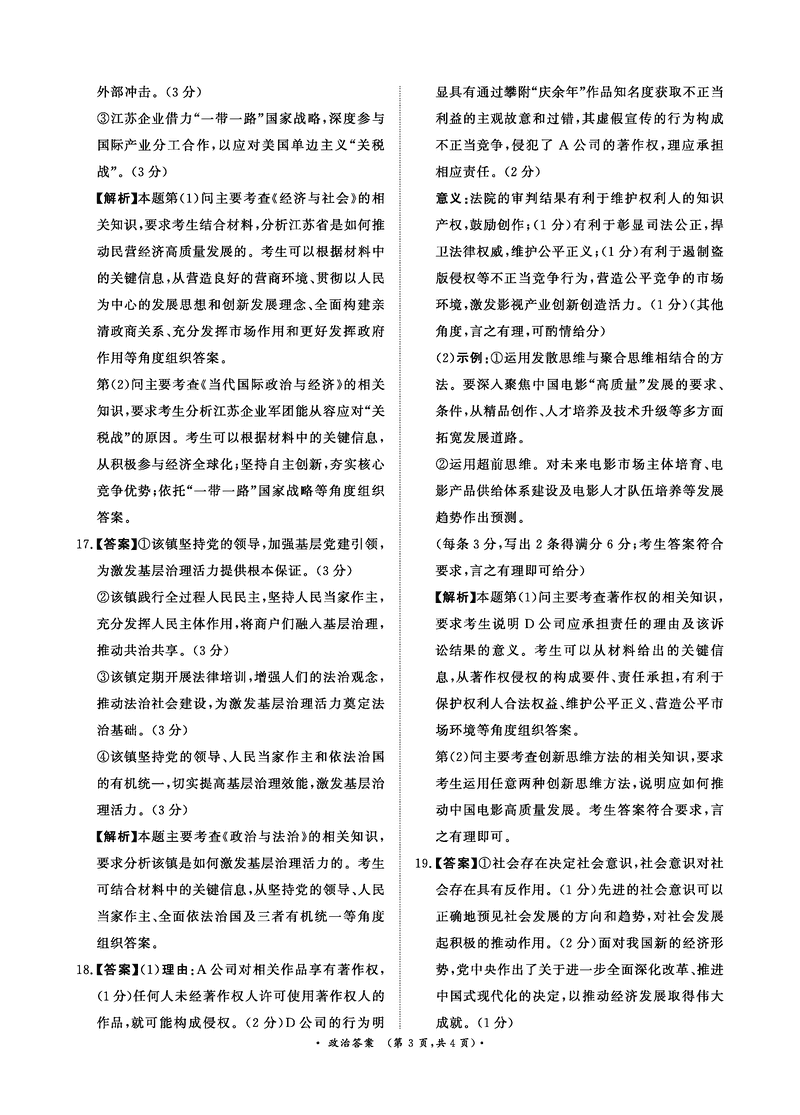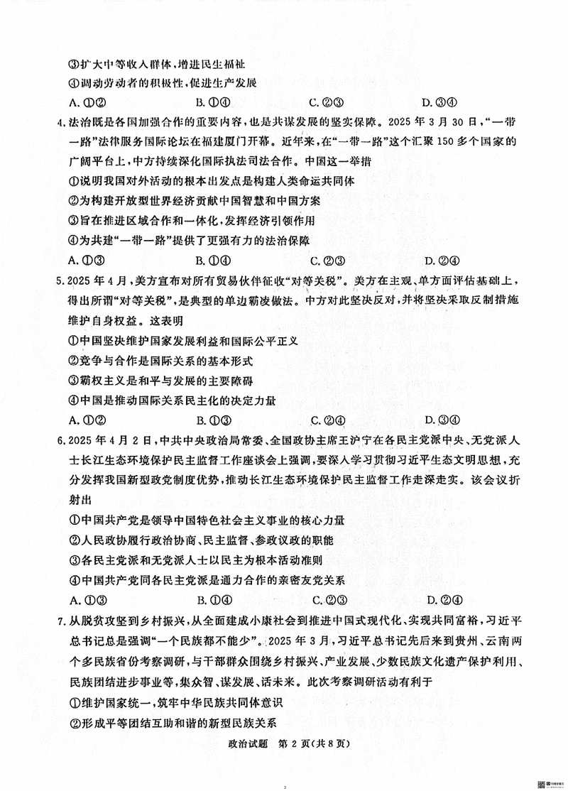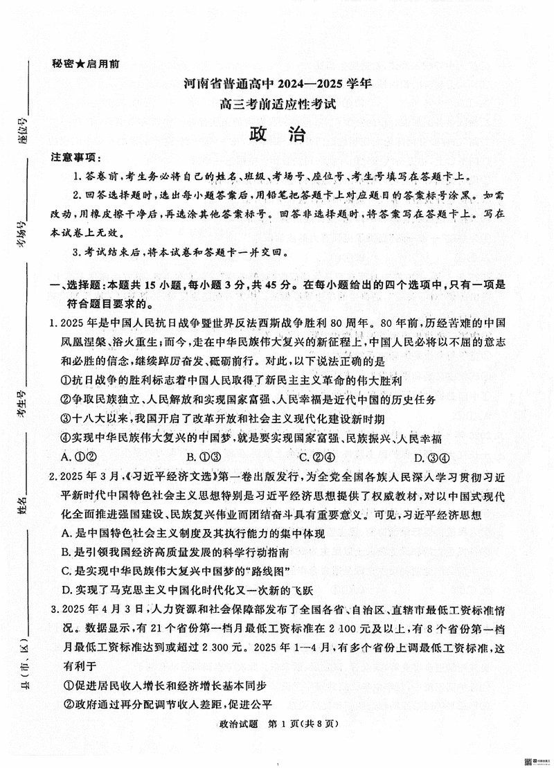 2025届河南青桐鸣5月高三考前适应性考政治试题及答案