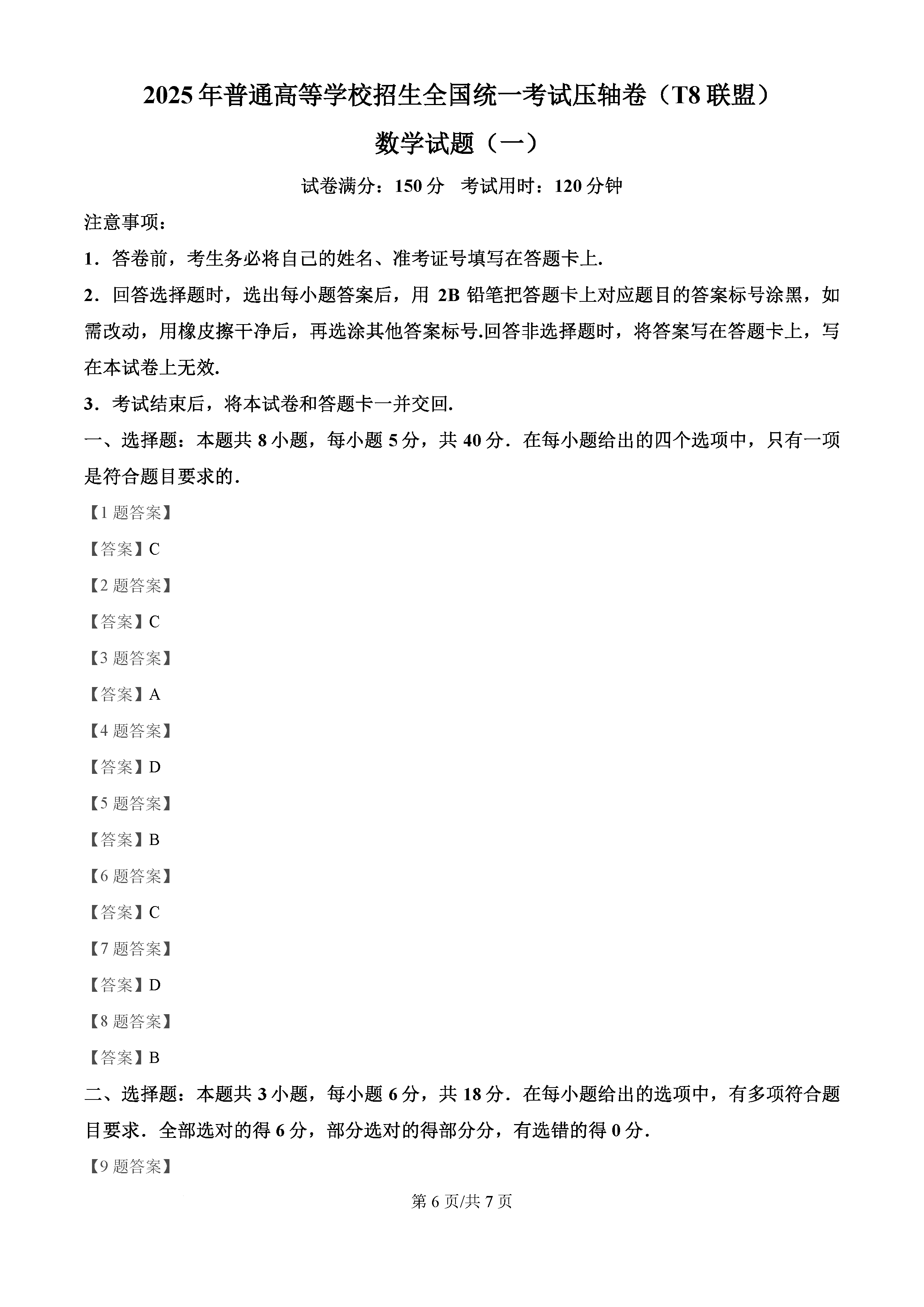 湖北省T8联盟2025届高三下学期高考考前模拟(一)数学试题及答案 时间:2025-05-17 湖北 数学试题 湖北省T8联盟2025届高三下学期高考考前模拟(一)数学考试已于近日开考,为方便考生考后及时查看考试情况,查漏补缺、弥补不足,本文整理了试题答案解析相关信息! 汇总: 数学试题及答案解析